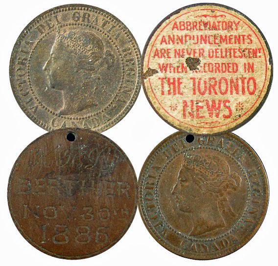 Advertising token on an 1886 Large cent. The Toronto News, Berthier Nov 3oth 1886. Scarce and quite unusual. VF.