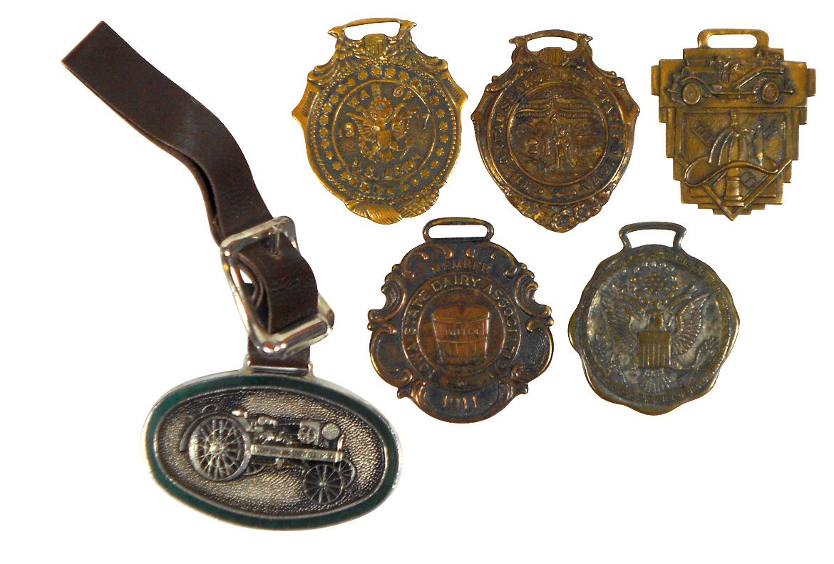Advertising watch fobs (6), John Deere Waterloo Boy Tractor Fob of the Month #1, Waterloo Gasoline Engine Co. w/strap, U.S. Army War of 1917, another w/U.S. Army seal, Iowa State Dairy Assoc. 1911 w/cow on one side & butter pail on reverse, The Great Seal of the State of Iowa, 14K gold plated over bronze & fob w/fire engine, hat & nozzle by Bastian Bros.-Rochester, NY, all Exc cond, up to 5"L.
