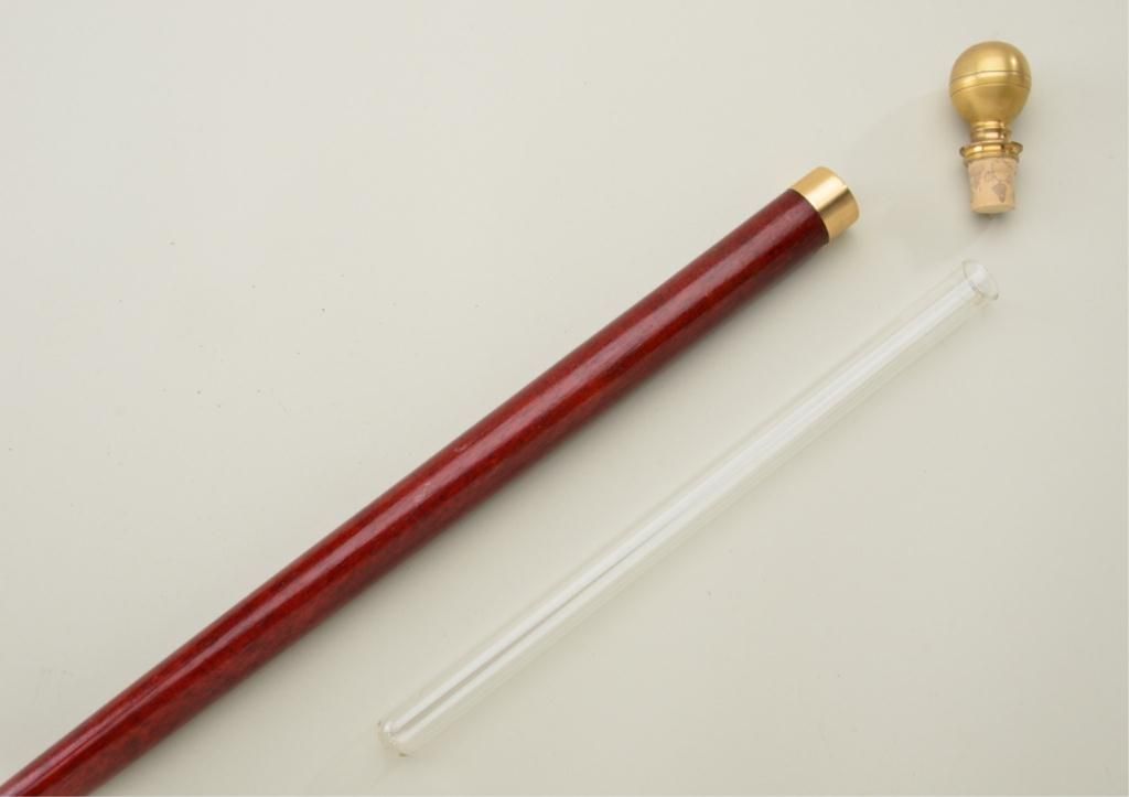 Advertising wood walking stick with brass head that screws out to reveal a removable glass flask in the body of the cane; in very good condition and a great conversation piece or necessity for those cold late night walks when there is a wee bit of a chill in the air. Est.: $100-$200.