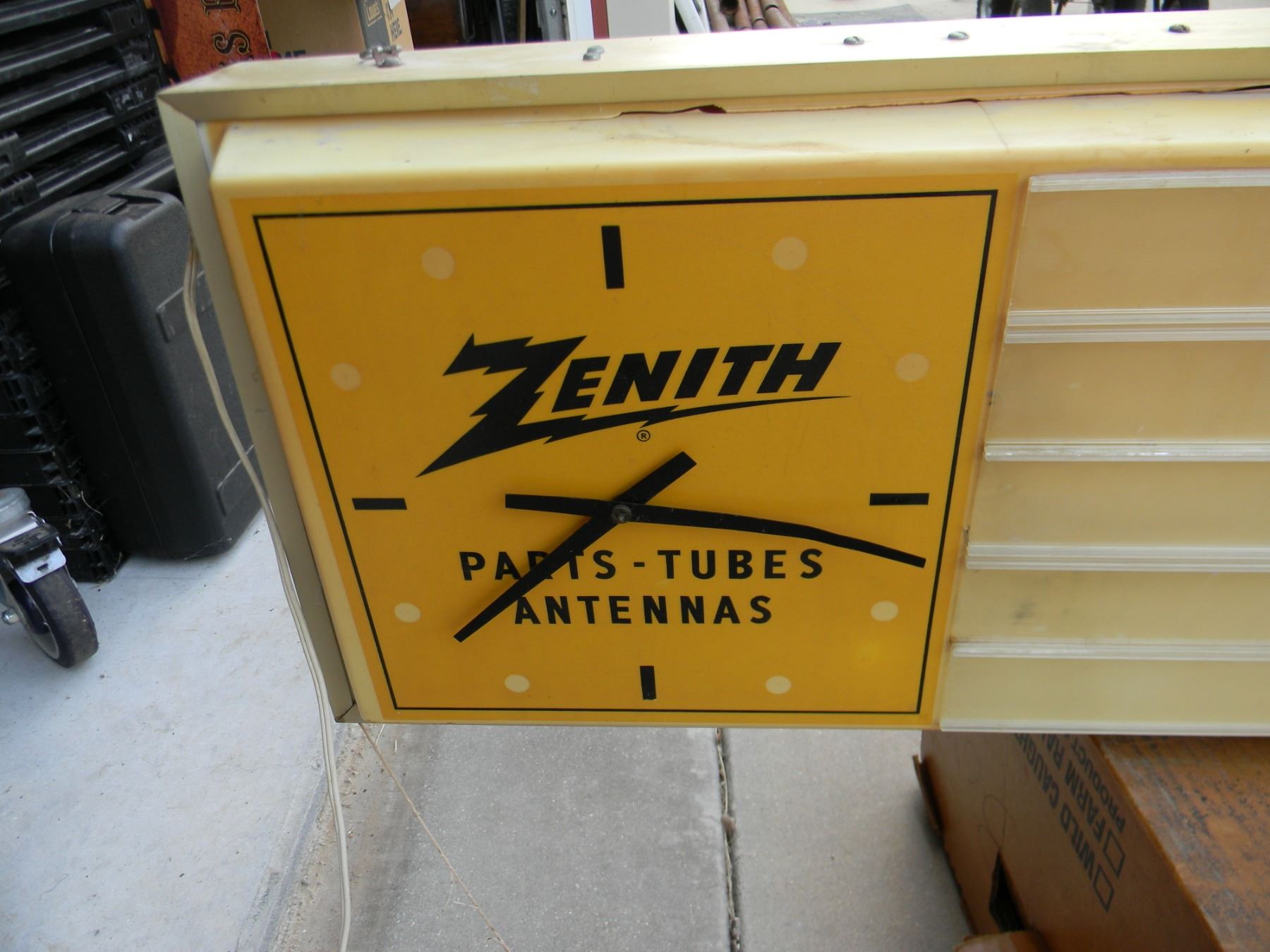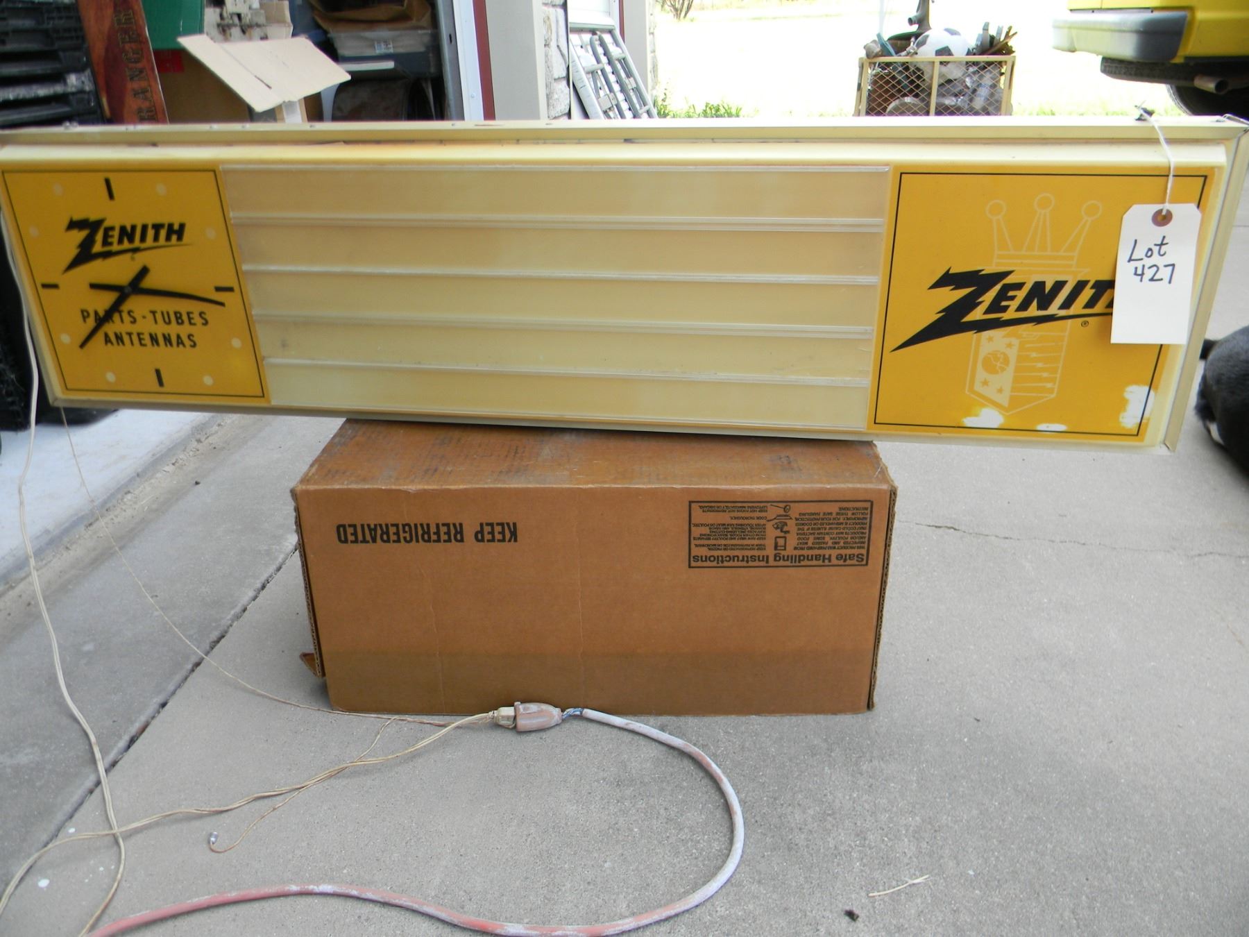 Zenith advertising clock and lighted sign; has some cracks in sign, but appears repairable.