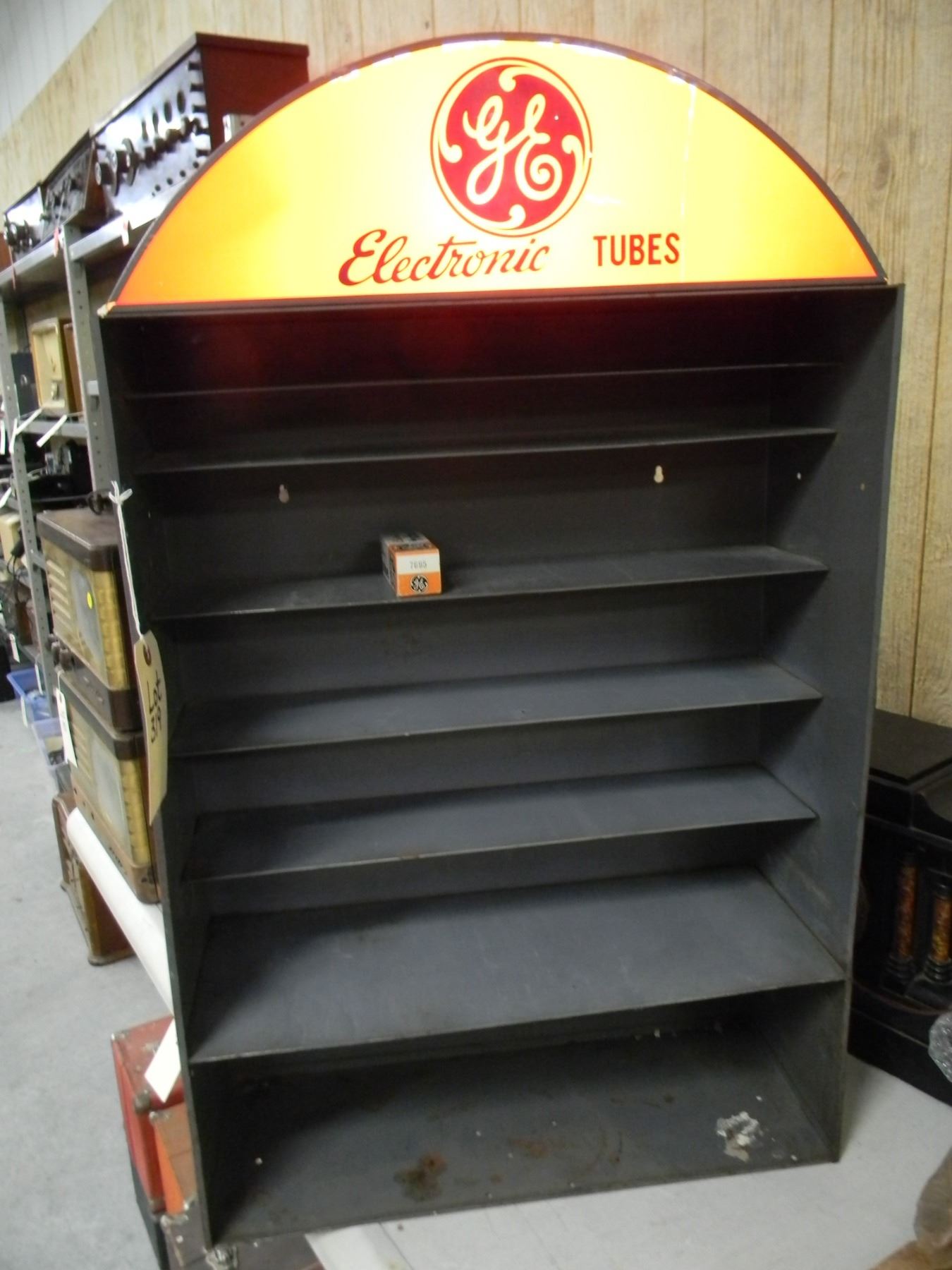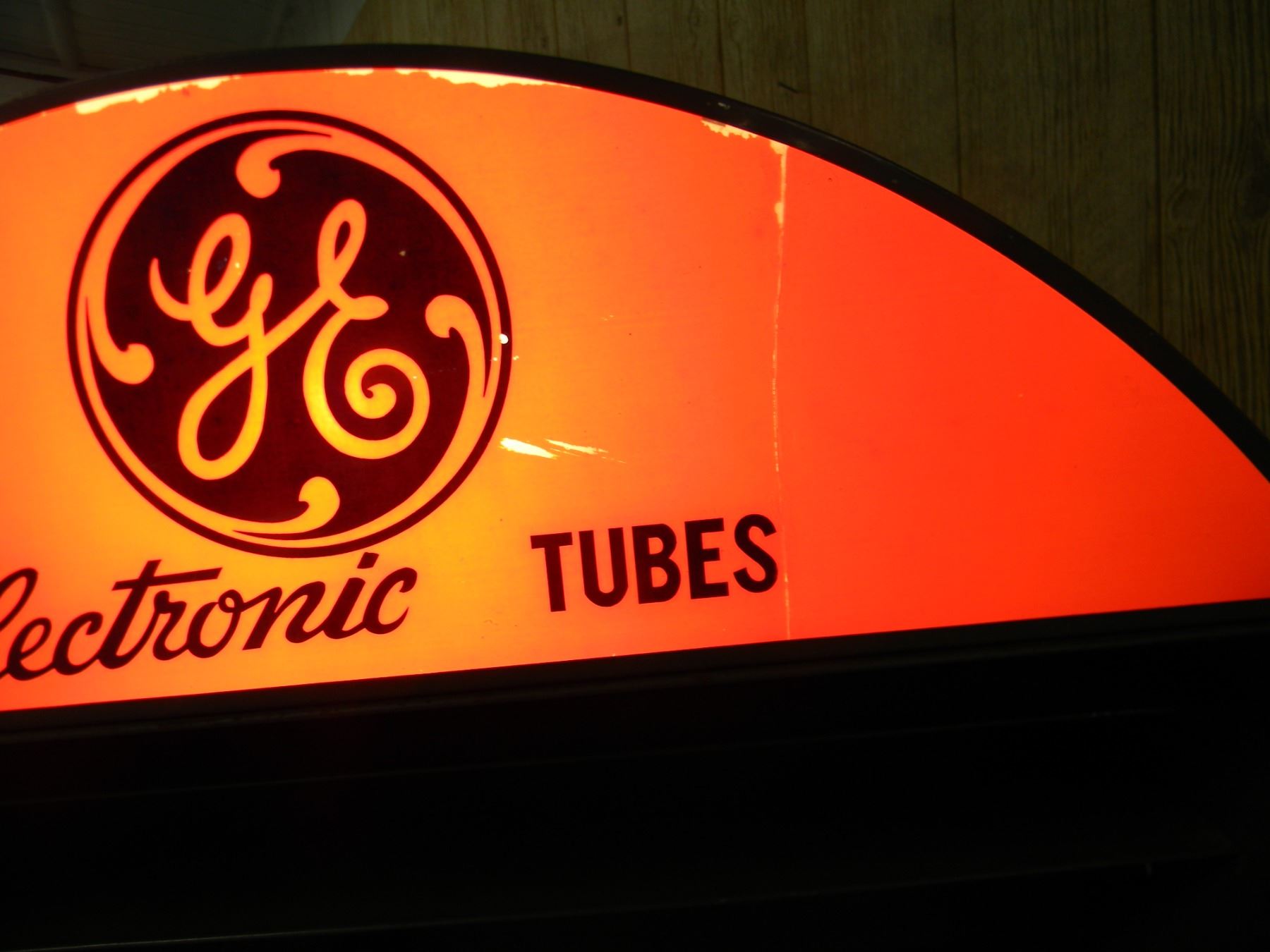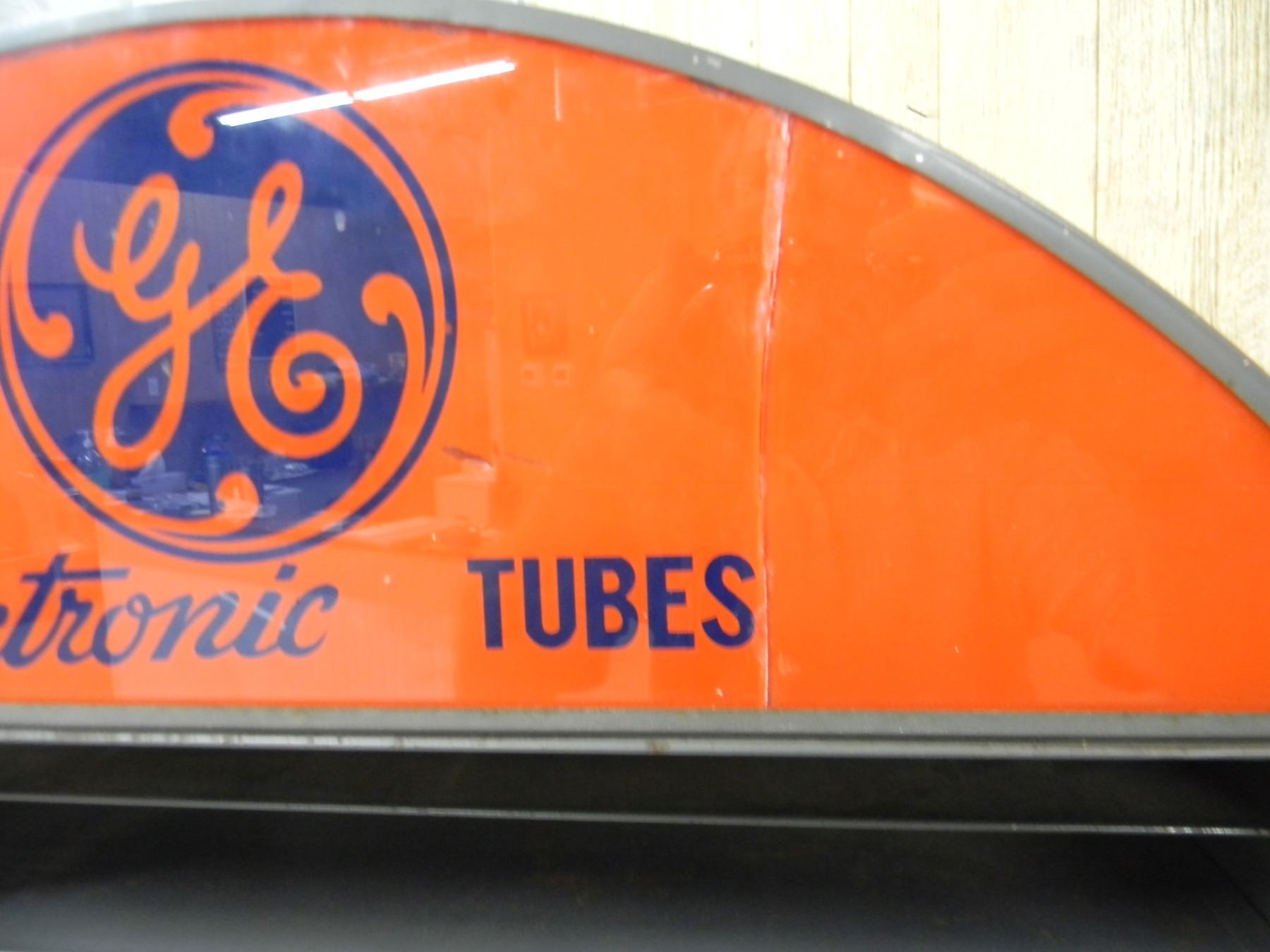 General Electric lighted tube display. 34" tall, 21" wide, 8" deep. Glass is cracked, but repaired. Works