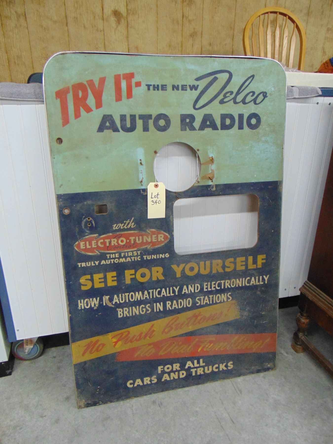 Large Delco sign advertising car radio and speaker