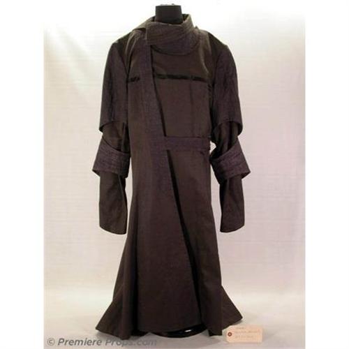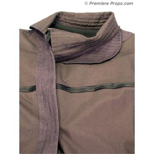AEON FLUX - This Inari's (Yangzom Brauen) screen worn futuristic design gray full length over coat! There is no size indicated, button up front, black ribbon accents, and designed and made by studio just for movie. This incredible wardrobe includes a costume department wardrobe tag! (AF1018)