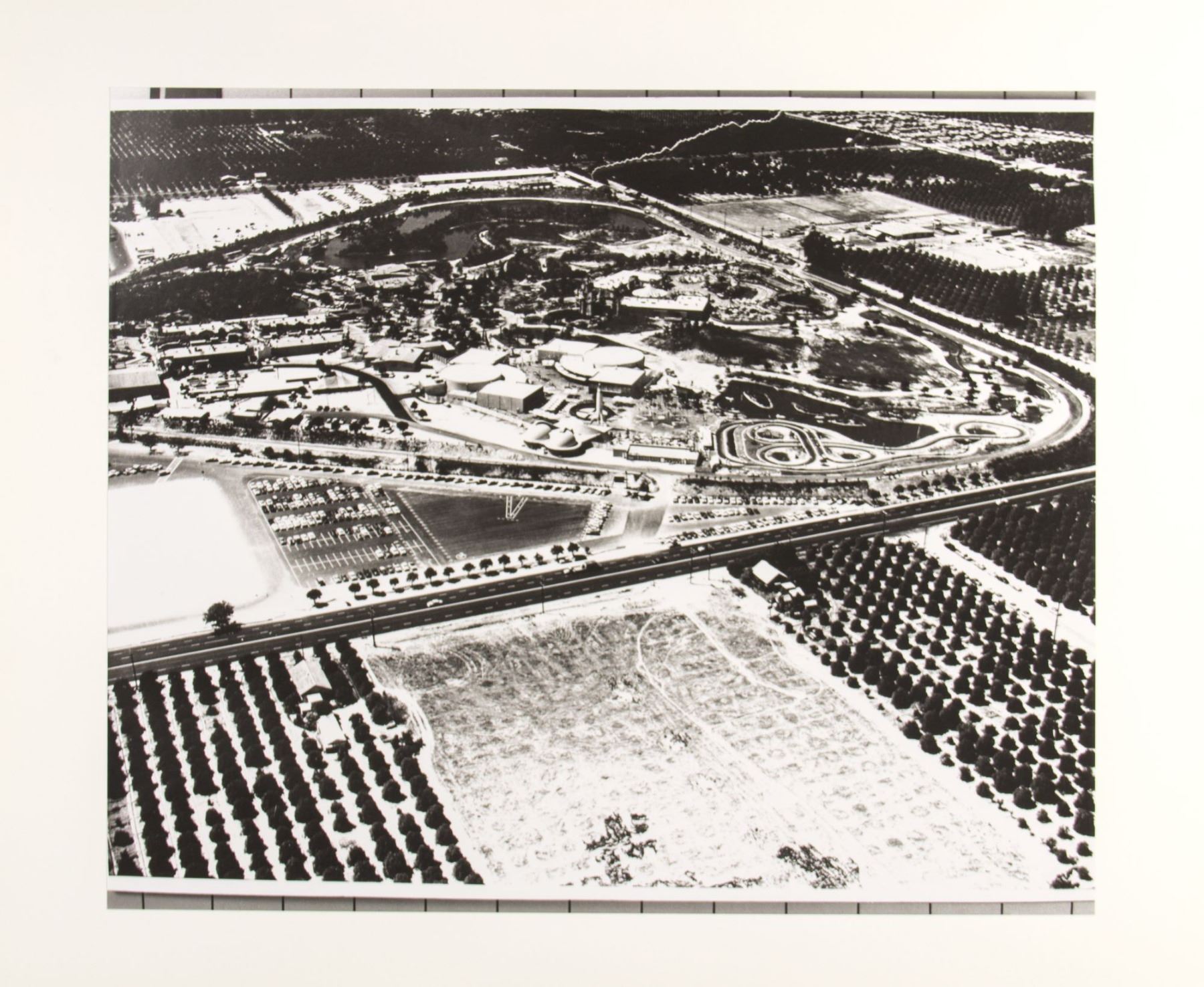 (Disneyland, 1955) A large aerial photo of Disneyland taken in 1955. This Walt Disney Studios print is on high-quality photo paper and has an image size of 20"x24" on its 24.5"x29.75" backing. The condition is very good, with an image of a tear along the top edge that was transferred from the original torn photo.