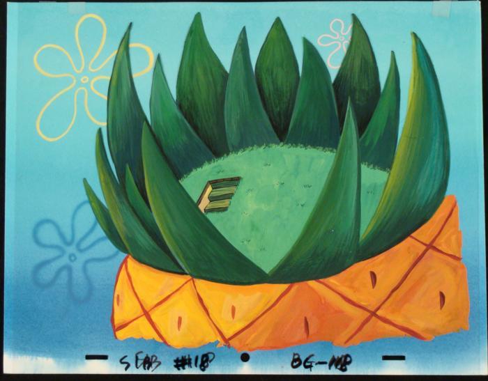 This original hand-painted background and animation cel are from the Nickelodeon TV show SpongeBob Squarepants. The story takes place under the deep blue sea in Bikini Bottom, where SpongeBob resides. SpongeBob, who is a yellow, porous sponge, is your typical happy-go-lucky character, as he is always cheerful and enjoys making people laugh. Patrick Star, SpongeBob's neighbor who is a starfish, is your average children's show idiot, as he boasts knowing nothing and is often getting himself into ridiculous situations. Between the homes of these two lies the home of the miserable Squidward, a squid, who is known for being grouchy and playing tricks on SpongeBob and Patrick. Both SpongeBob and Squidward work at the Krusty Krab, a fast food business run by the greedy money-loving Mr. Krabs, a crab, the arch rival of the evil, possibly misunderstood, Plankton. Another neighbor, Sandy Cheeks, an athletic squirrel who normally wears an astronaut's space suit, was introduced in "Tea at the Treedome." She spends most of her time inventing and experimenting. It is a aerial view of SpongeBob's house.Original Production Background and Animated Cel Overall Size of Background: 10 1/2" x 13" Overall Size of the Cel: 10 1/4" x 12 1/2" Very good condition This is an original hand-painted cel set-up used in the production of an episode of "SpongeBob SquarePants." Each one-of-a-kind set-up represents a slight change in position of the characters. When individually photographed and projected in rapid succession, the images appear to move.