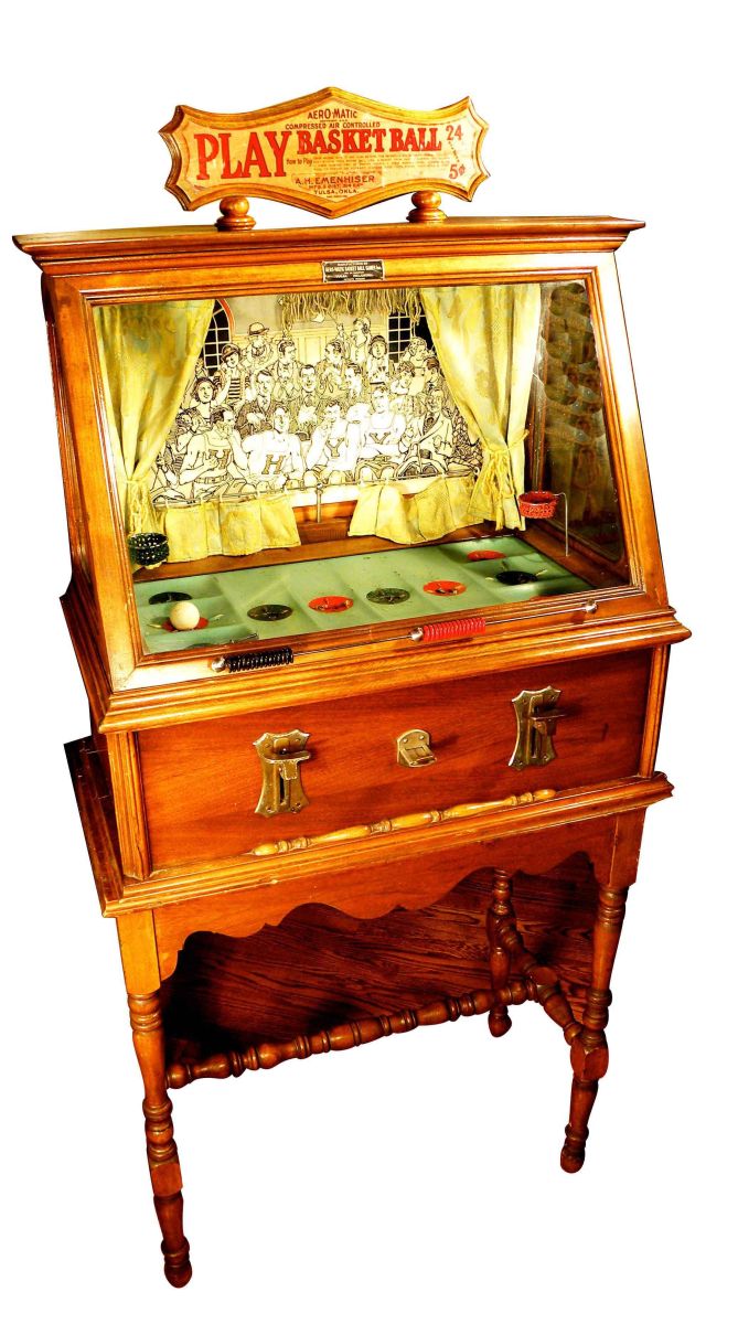 Coin Operated Aero-Matic Compressed Air Basketball Game. The A.H. Emenhiser Mfg. & Distributor Co. Tulsa, OK. Good original working condition. 30 1/2 X 65 X 17 1/2 inches.