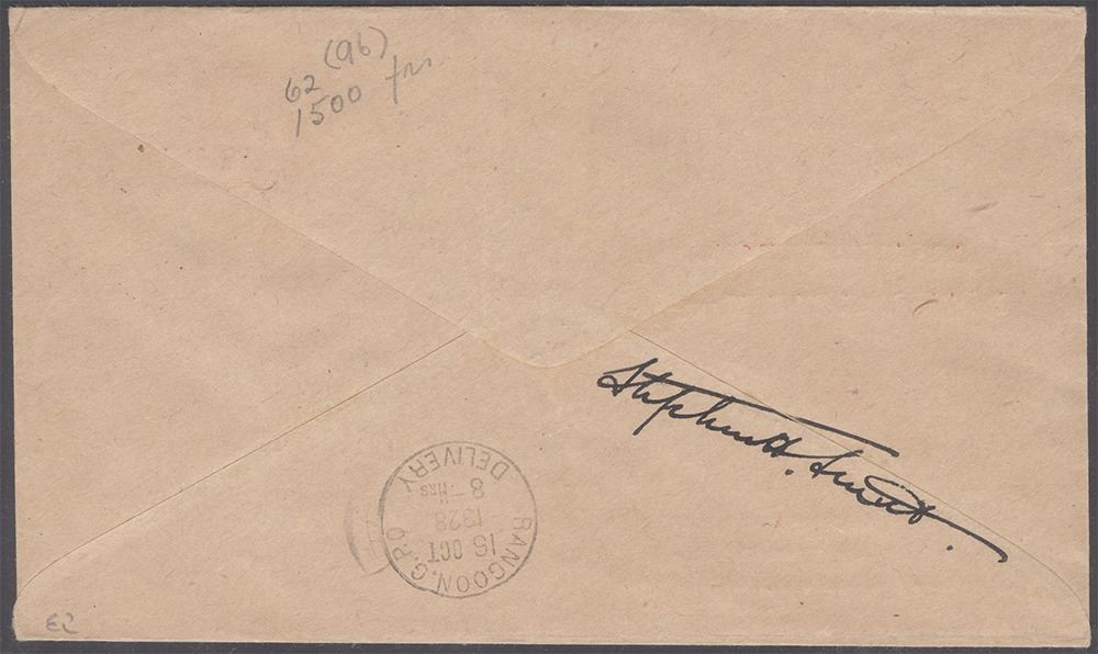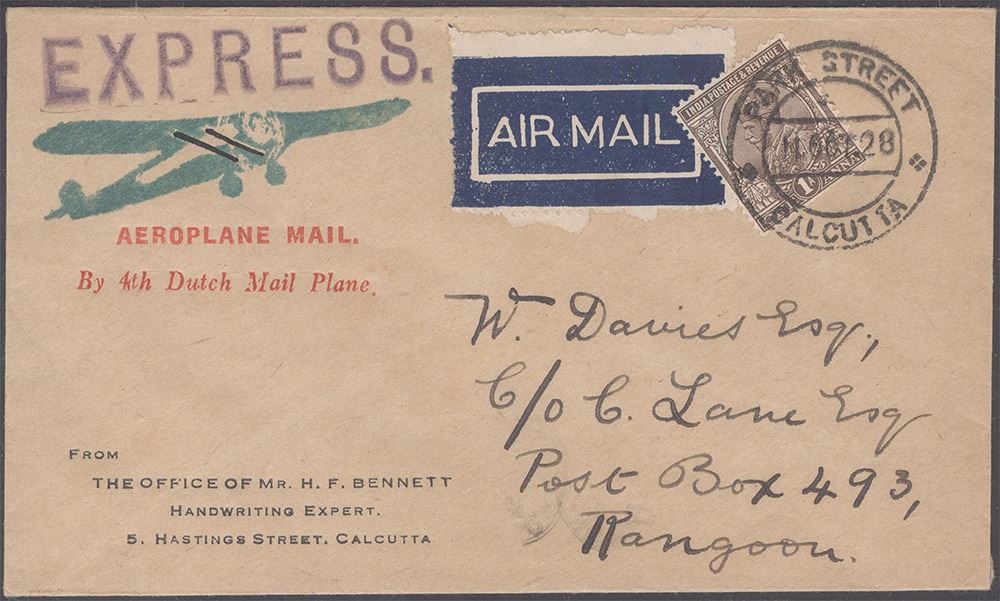 KGV, 1928,Air Mail, 1a(Ing. of New Delhi 1931)1a(brown),Aeroplane Mail,4thDutch mail plane, Address to Rangoon,Cancelled at Park Street Calcutta on 11 Oct 1928 with Rangoon Dely on back 16 Oct 1928,Signed by Stephen Smith on back,Excelent Condition, Rare.