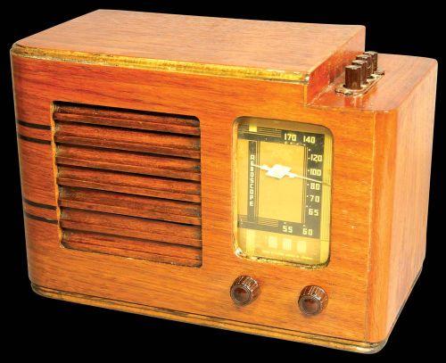 Aeroscope Radio Model 352-5R. Wood with bakelite trim, sticker on bottom shows last service 1946. No back, plastic plate for buttons on top broken otherwise very good condition. 11 X 7 X 6 inches.