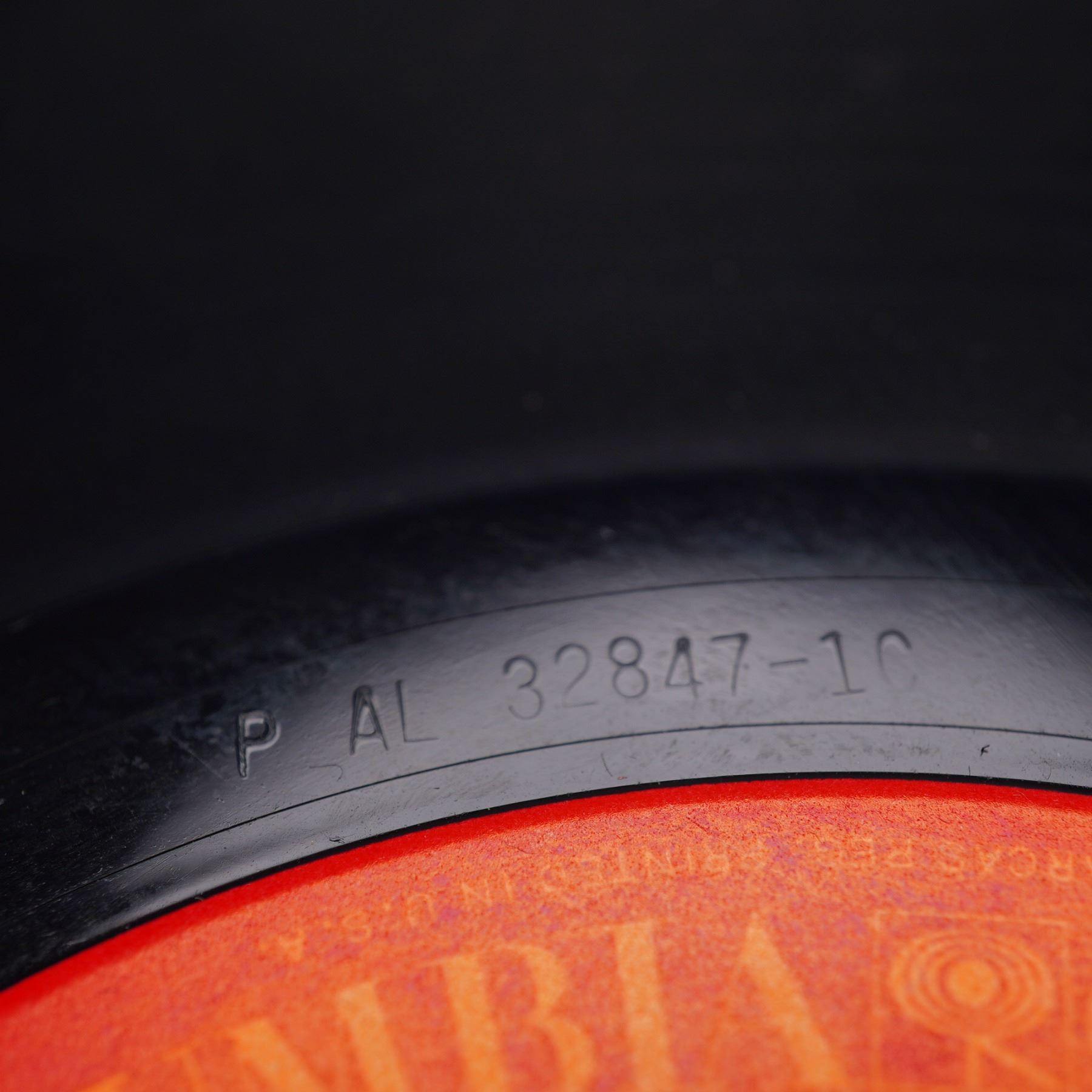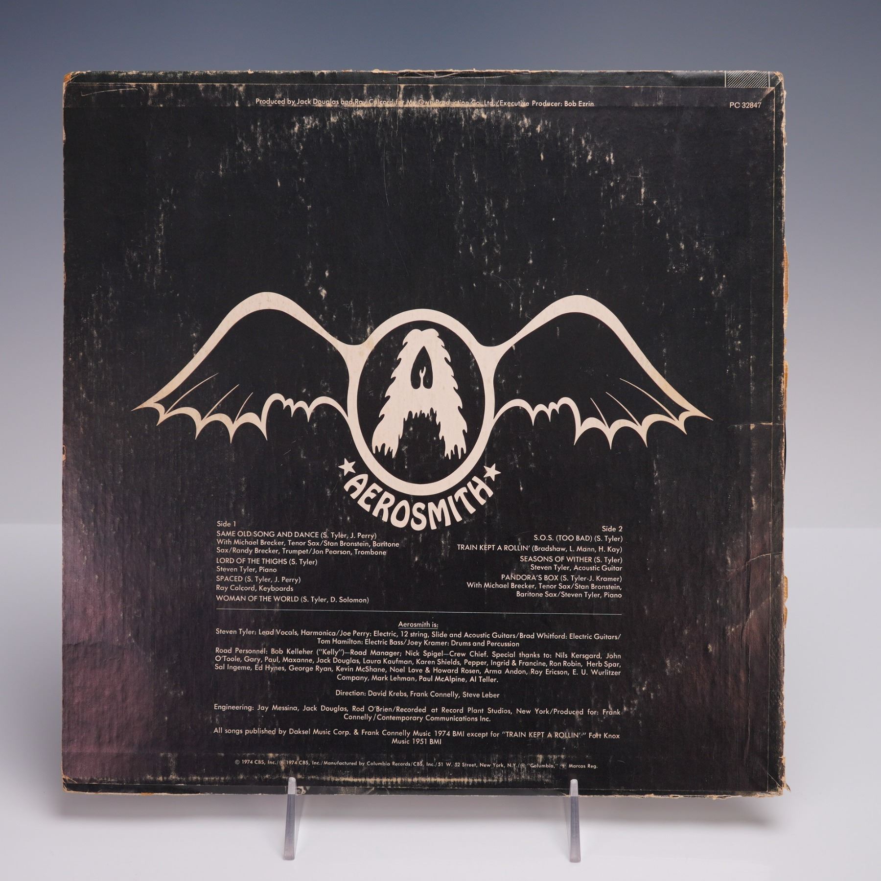 Original 1974 pressing of Aerosmith's Get Your Wings LP on Columbia Records, catalog number PC 32847. This early red label pressing features matrix number P AL 32847-1C etched in the runout, identifying it as part of the initial production batch. Includes standout tracks Same Old Song and Dance, Lord of the Thighs, and Train Kept a Rollin. Measures approximately 12.5"L x 12.5"H.