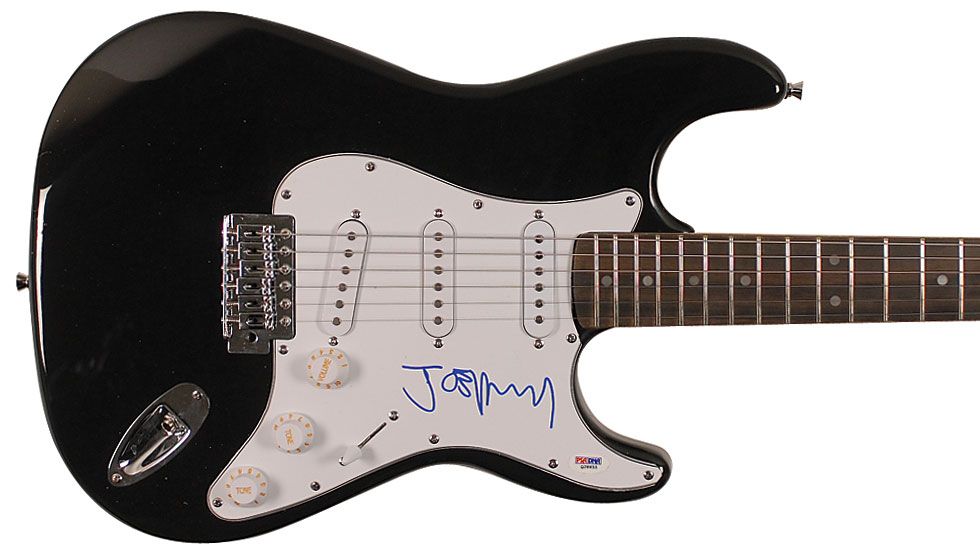 Black-bodied Crescent ‘stratocaster-style’ electric guitar, signed on the white pickguard in blue felt tip. In fine condition, with a PSA/DNA authentication label affixed to pickguard. Accompanied by a certificate of authenticity from PSA/DNA and two photos taken at time of signing. Oversized.