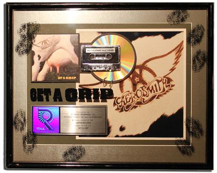 Aerosmith's ''Get a Grip'' Multi-Platinum record issued by the Recording Industry Association of America (RIAA) and presented to Ill-Eagle Enterprises, LTD. to commemorate the sale of more than 2,000,000 copies sold. The award includes a cassette tape stating ''Multi-Platinum Sales Award'', the album's cover art and a commemorative plaque with an RIAA hologram. Items are enclosed in a 21'' x 17'' black frame with thumbprint artwork on top glass. Very minor scratches on frame, else fine condition.