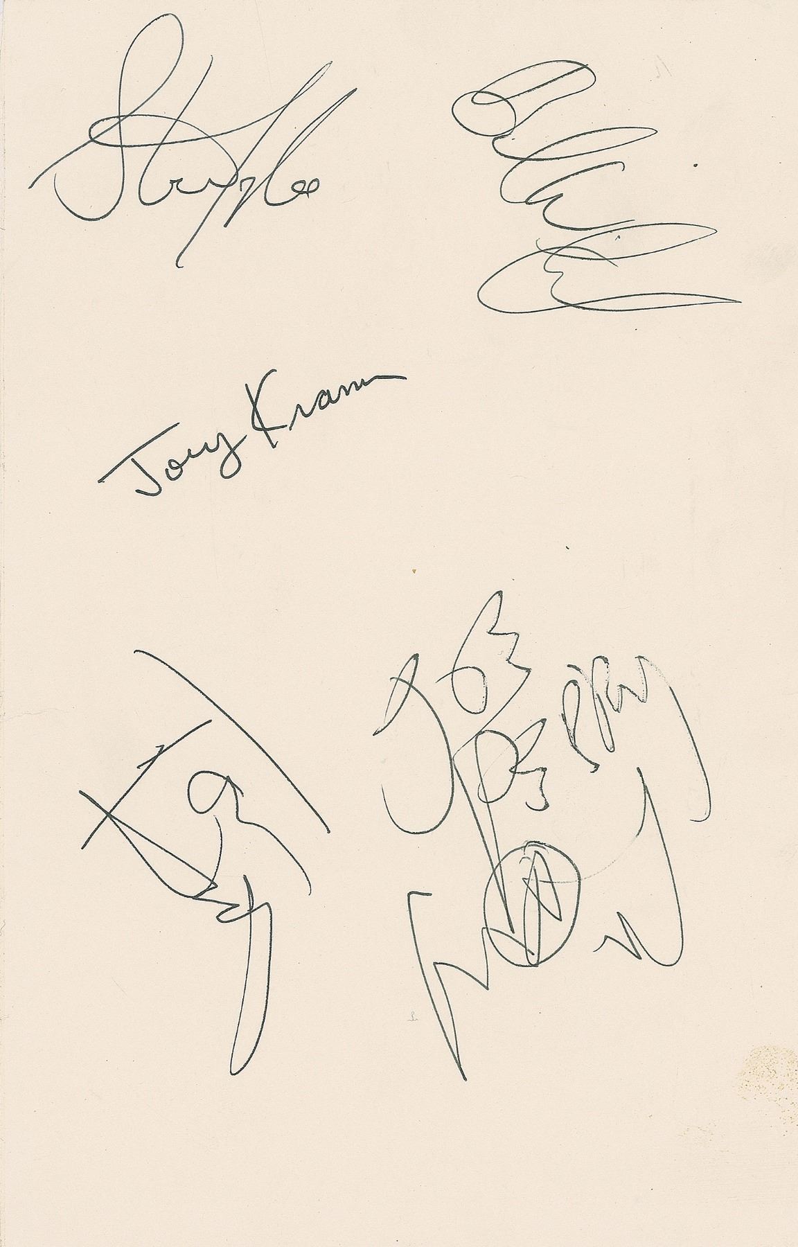 Felt tip signatures of Steven Tyler, Joe Perry (adding a sketch of Aerosmith wings), Joey Kramer, Brad Whitford, and Tom Hamilton on an off-white 6 x 9 page removed from the book Walk This Way. In fine condition, with a short tear to the left edge, and a light fingerprint to the lower right edge.