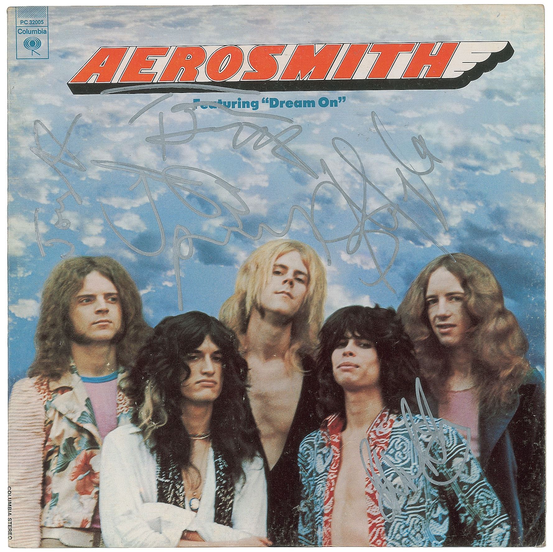 Self-titled debut album from Aerosmith, signed on the front cover in silver ink by Steven Tyler, Joe Perry, Tom Hamilton, Brad Whitford, and Joey Kramer. In fine condition. The record is not included.