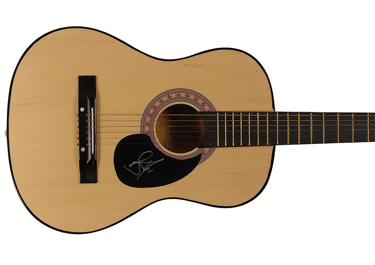 Natural wood-finish six-string acoustic guitar, quickly signed on the black pickguard in silver ink by Tyler. In fine condition. Oversized.