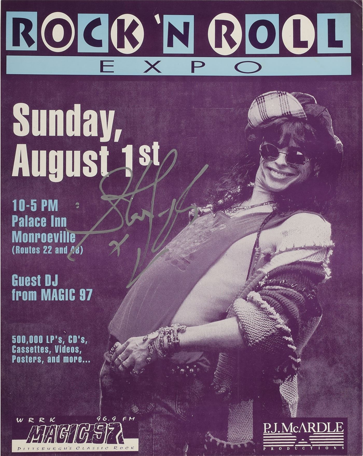 Original color 17 x 22 first printing poster portraying the Aerosmith frontman for the "Rock 'n Roll Expo" on August 1 at the Palace Inn, Monroeville, prominently signed in silver ink by Steven Tyler. In fine condition.