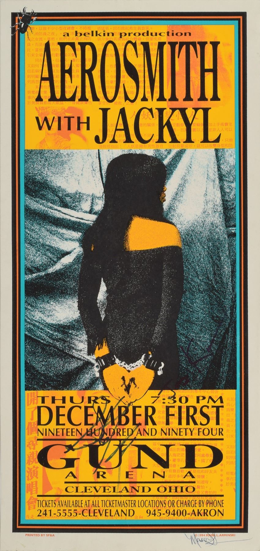 Original color 10.5 x 22.25 first printing poster for an Aerosmith concert at the Gund Arena in Cleveland, Ohio, on December 1, 1994, listing the supporting act as Jackyl, signed in black felt tip by Steven Tyler and Joey Kramer. Also signed in the lower border by poster artist Mark Arminski. In fine condition.