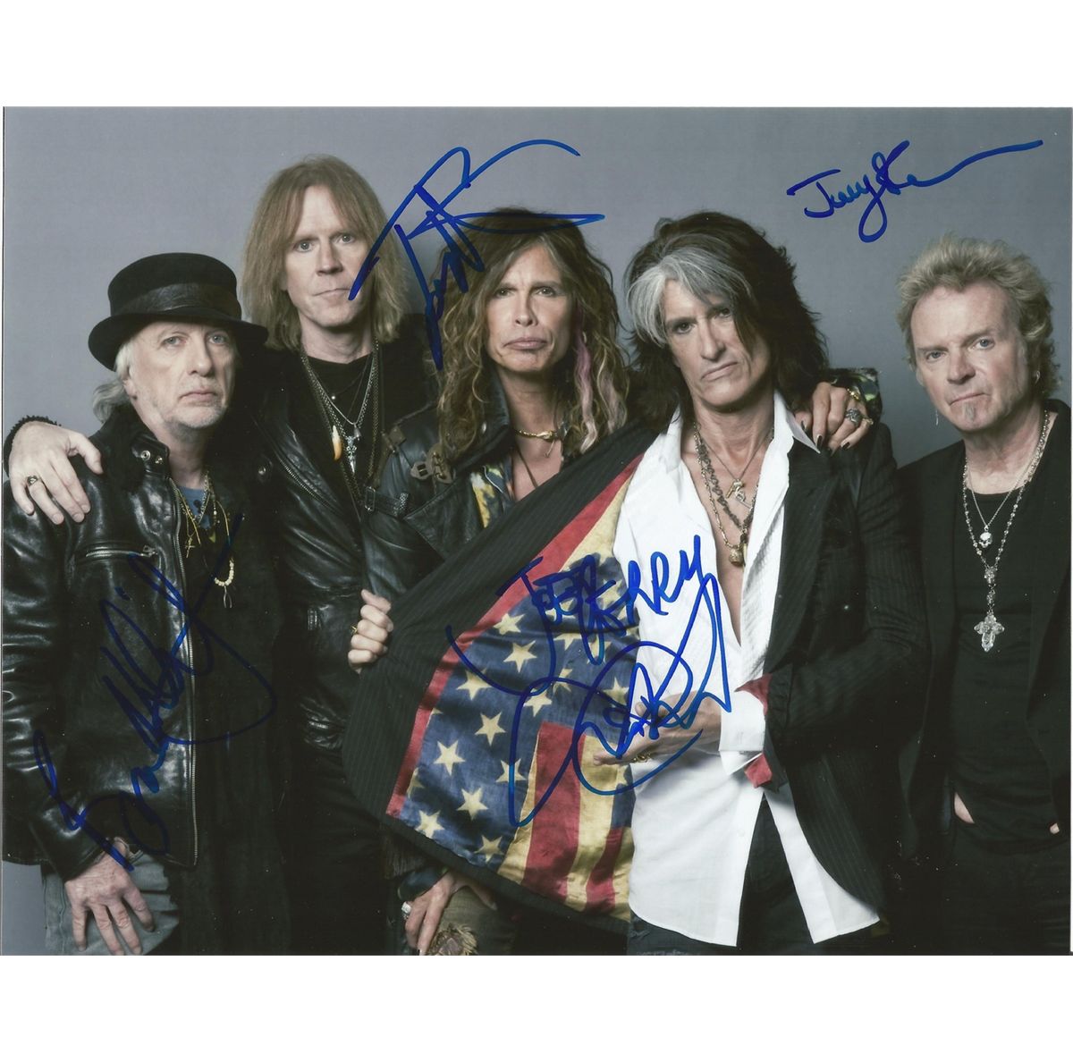 Aerosmith color glossy 8x10 signed by entire band – Steven Tyler, Joe Perry, Joey Kramer, Brad Whitford and Tom Hamilton