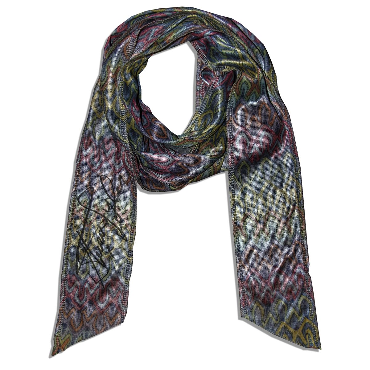 Aerosmith lead singer Steven Tyler signed scarf. Multi-color scarf of the kind Tyler often has tied to his microphone stand is signed by the Rock and Roll Hall of Famer ''Steven Tyler / x'' in black felt tip at one end of the long piece. Tyler is also an inductee in to the Songwriters Hall of Fame. Scarf is stitched near the ends for draping. Measures 129'' x 2.75''. Near fine. From the ''Loosen Up'' charity auction of ties and scarves by Cahonas Scotland for awareness of male cancers.