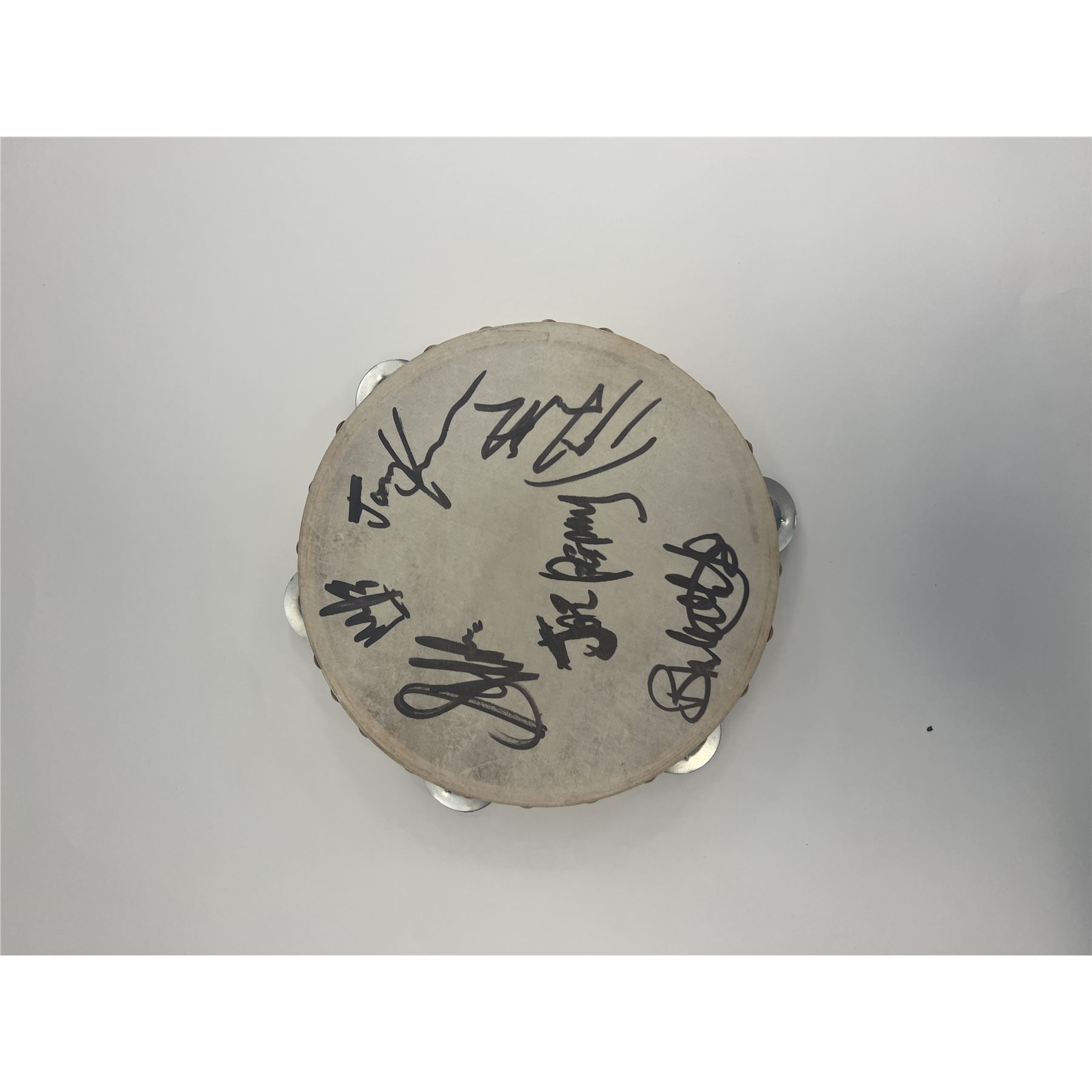 Aerosmith signed tambourine autographed by Steven Tyler, Joe Perry, Joey Kramer, Tom Hamilton and Brad Whitford