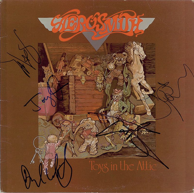 Toys in the Attic album signed on the front cover in blue or black felt tip by Steven Tyler, Joe Perry, Brad Whitford, Tom Hamilton, and Joey Kramer. With scattered creasing to edges and corners, with a longer crease extending down from the top edge, and scattered light cover wear mainly to the edges, otherwise fine condition. The record is included. Accompanied by a certificate of authenticity from Roger Epperson/REAL.