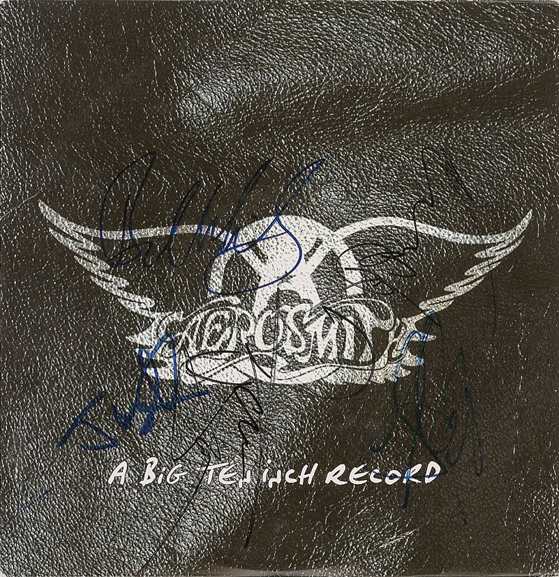 A Big Ten Inch Record album signed on the front cover in blue and black felt tip by Steven Tyler, Joe Perry, Brad Whitford, Tom Hamilton, and Joey Kramer. Light contrast to several of the signatures, some scattered light surface marks and creases, and a moderate album impression to cover, otherwise fine condition. The record is included.