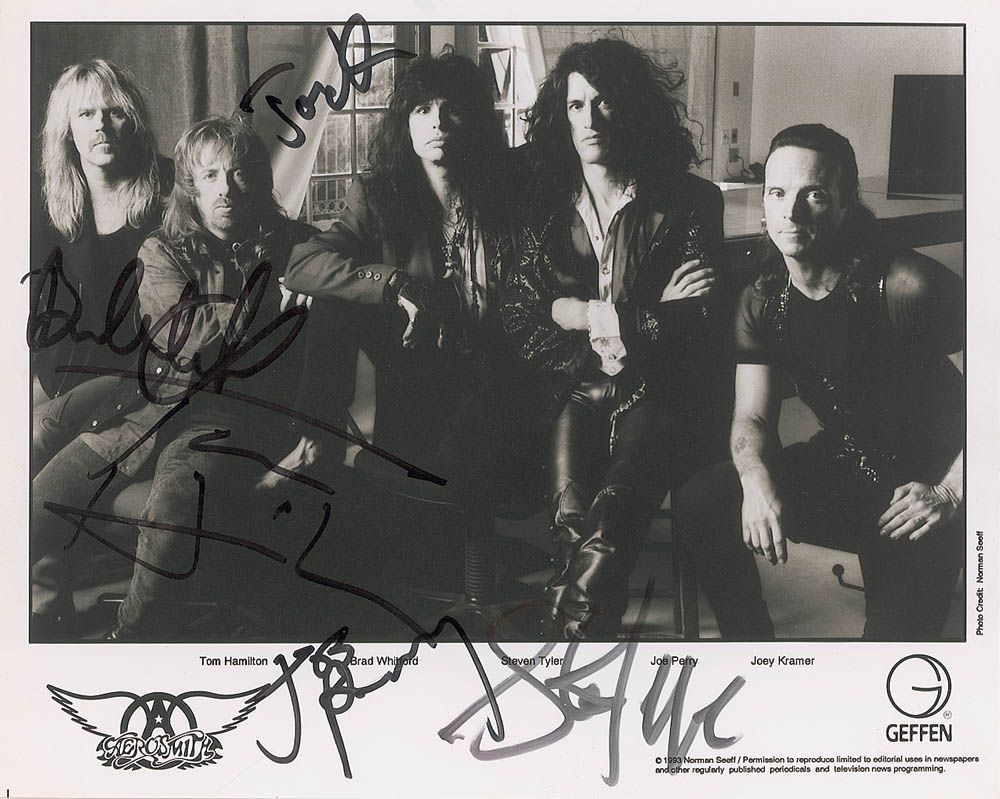Satin-finish 10 x 8 Geffen Records promotional photo, signed in black felt tip by Steven Tyler, Tom Hamilton, Brad Whitford, Joe Perry, and Joey Kramer. Some light contrast to a couple of signatures and a few slight surface creases, otherwise fine condition.