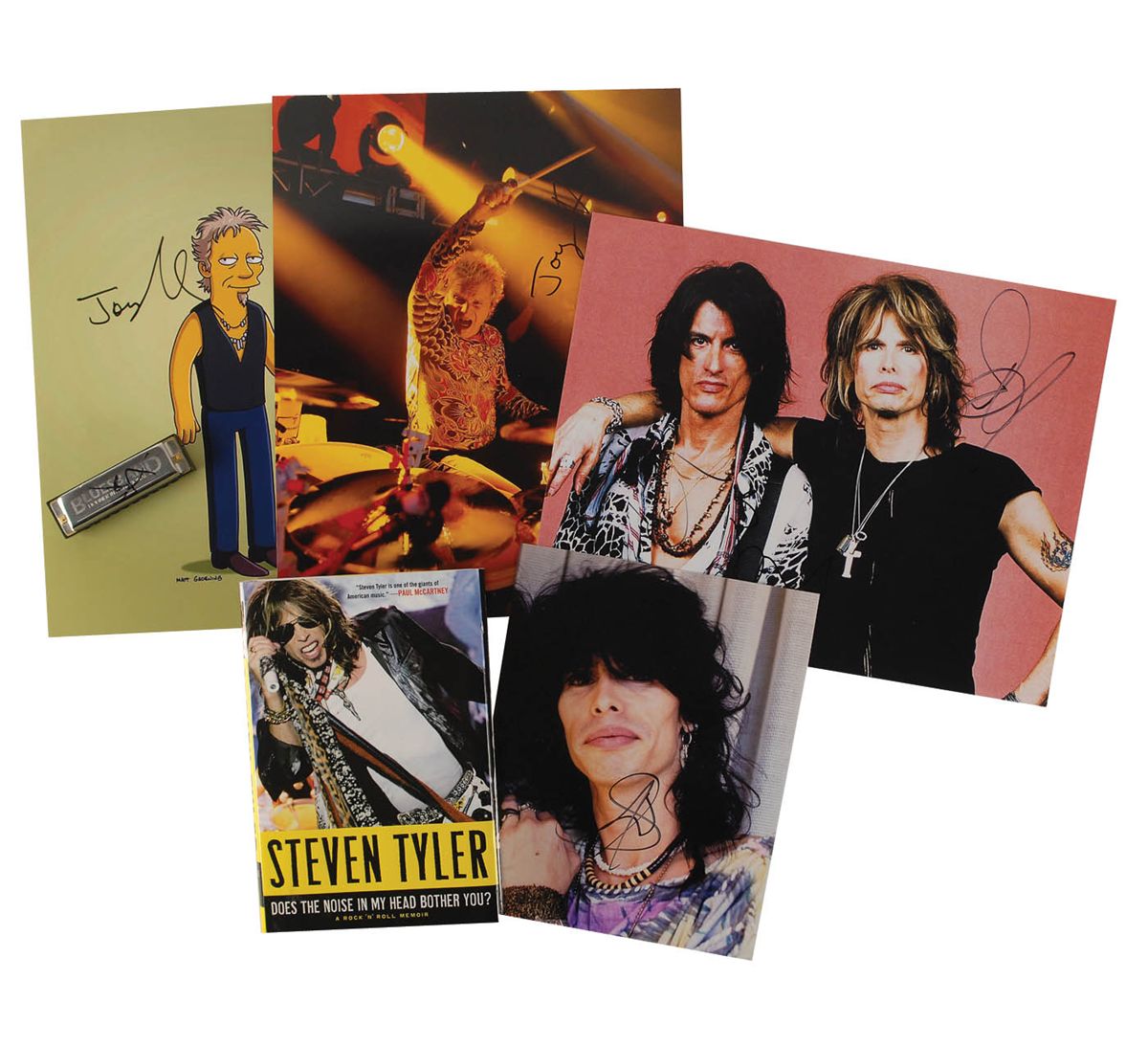 Four color satin-finish photos, one 8 x 10 and three 11 x 14, signed by Steven Tyler, Steven Tyler and Joe Perry, and Joey Kramer (2) respectively; a Blues Band harmonica signed in black felt tip by Tyler; and a hardcover copy of Does the Noise in My Head Bother You, signed on the first free end page in black felt tip by Tyler. In very good condition, with scattered creases to photos, and Perry’s signature fairly light.