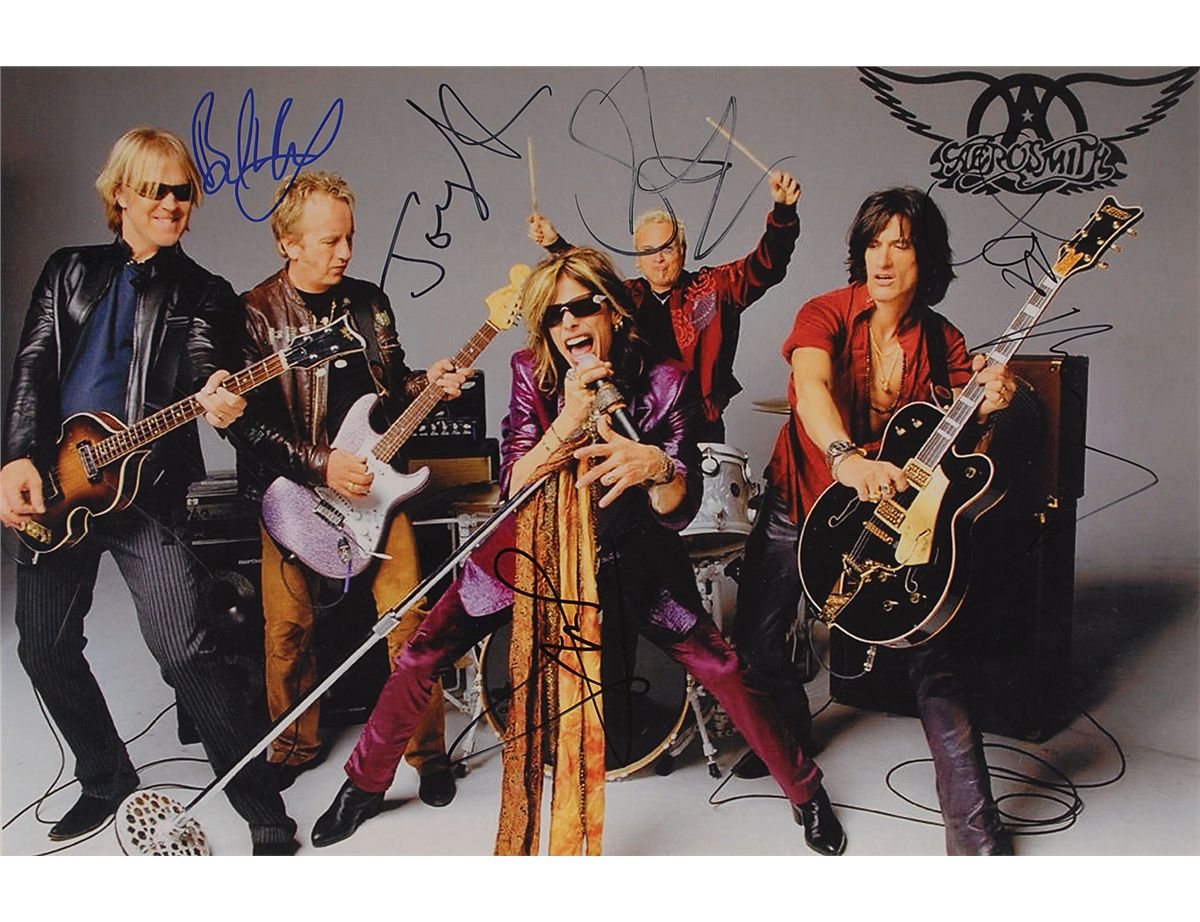 Color satin-finish 18 x 12 photo of the band, signed in black felt tip by Steven Tyler, Joe Perry, Brad Whitford, Tom Hamilton, and Joey Kramer. In fine condition, with a few light bends and image a bit grainy and some light curling from having been previously rolled.