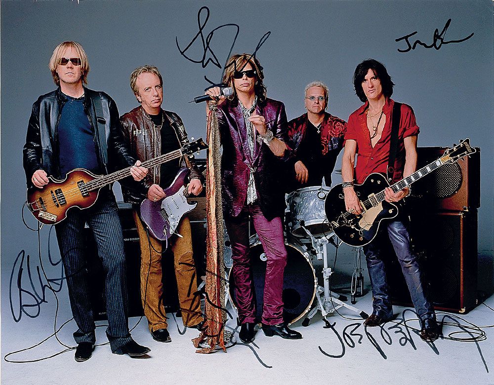 Color satin-finish 14 x 11 photo of the band posing with their instruments, signed in black felt tip by Steven Tyler, Joe Perry, Brad Whitford, Tom Hamilton, and Joey Kramer. In fine condition, with a few scattered creases.