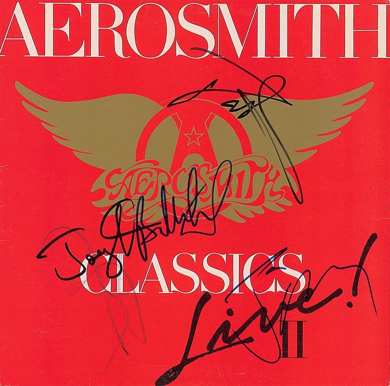 Classics Live II album signed on the front cover in blue and black felt tip by Steven Tyler, Joey Kramer, Joe Perry, Tom Hamilton, and Brad Whitford. Kramer has signed over Tyler’s light but legible signature, otherwise fine condition. The record is not included. Accompanied by a full letter of authenticity from PSA/DNA.