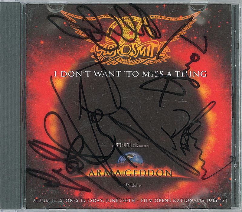 ‘I Don’t Want to Miss a Thing’ CD single from the Armageddon soundtrack, signed on the inside of the case cover in black felt tip by Steven Tyler, Joe Perry, Brad Whitford, Tom Hamilton, and Joey Kramer. In fine condition. The CD is included. A backstage pass from the Nine Lives 1997 tour is affixed to the reverse, stamp-dated October 13, 1998.