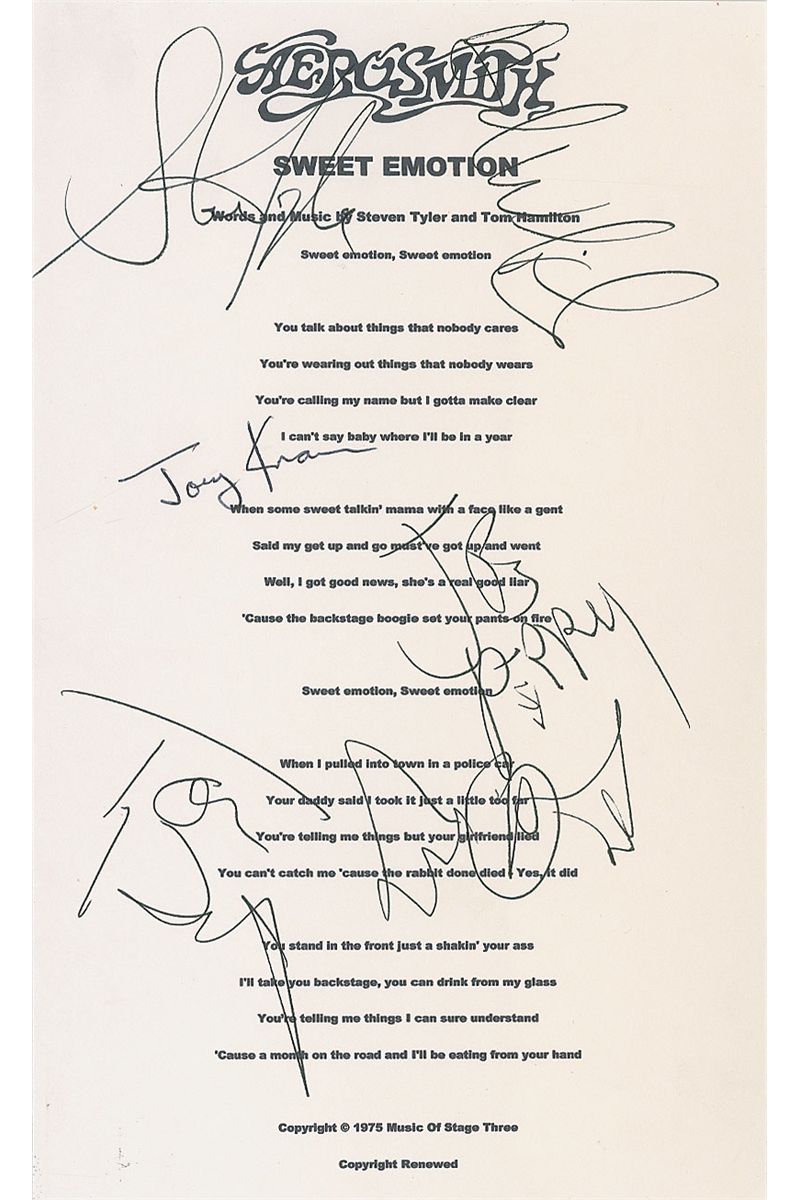 Souvenir printed lyrics to ‘Sweet Emotion,’ on an off-white 5.5 x 9 sheet, with an Aerosmith logo printed at the top, signed in black ink by Steven Tyler, Joe Perry, Brad Whitford, Tom Hamilton, and Joey Kramer. In very fine condition.