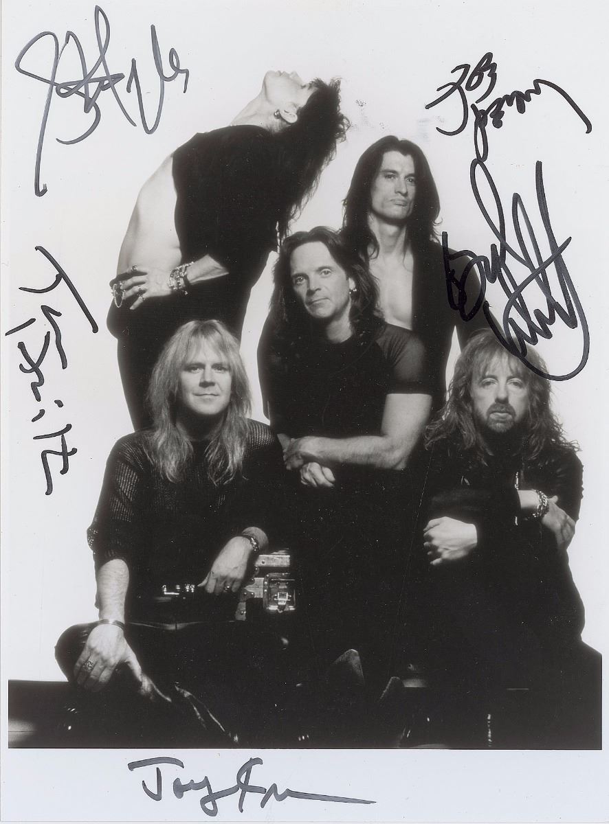 Satin-finish 7 x 9.5 group photo of Aerosmith, signed in black felt tip by Steven Tyler, Joe Perry, Brad Whitford, Tom Hamilton, and Joey Kramer. In fine condition, with a few stray ink marks above Perry’s head.