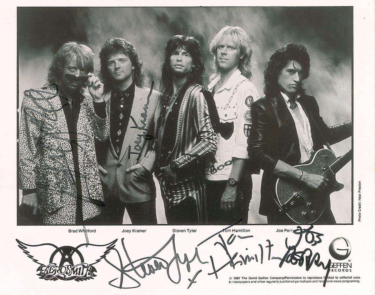 Satin-finish 10 x 8 Geffen Records publicity photo of Aerosmith circa 1987, signed in black felt tip by Steven Tyler, Joe Perry, Brad Whitford, Tom Hamilton, and Joey Kramer. In fine condition. Accompanied by a letter of provenance from its original recipient.