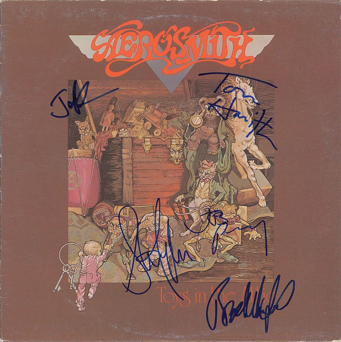 Toys in the Attic album signed on the front cover in blue felt tip by Steven Tyler, Joe Perry, Brad Whitford, and Joey Kramer. In fine condition. The record is included.