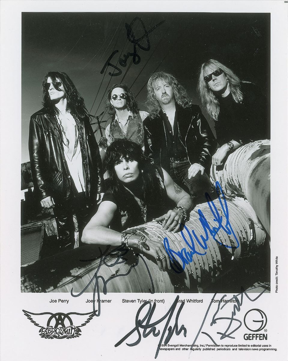 Circa 1994 satin-finish 8 x 10 Geffen Records publicity photo of Aerosmith during their Get a Grip period, signed in black felt tip by Steven Tyler, Joe Perry, Tom Hamilton, and Joey Kramer, and in blue felt tip by Brad Whitford. In fine condition.