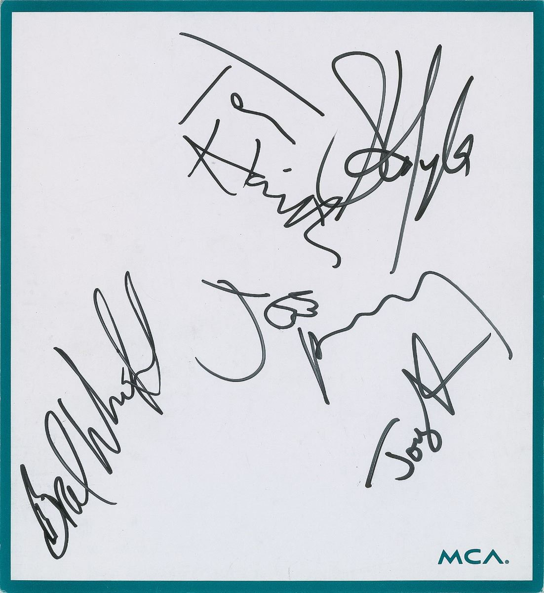 Felt tip signatures of Steven Tyler, Joe Perry, Brad Whitford, Tom Hamilton, and Joey Kramer on an off-white 9.5 x 10.25 MCA cardstock sheet. In fine condition.