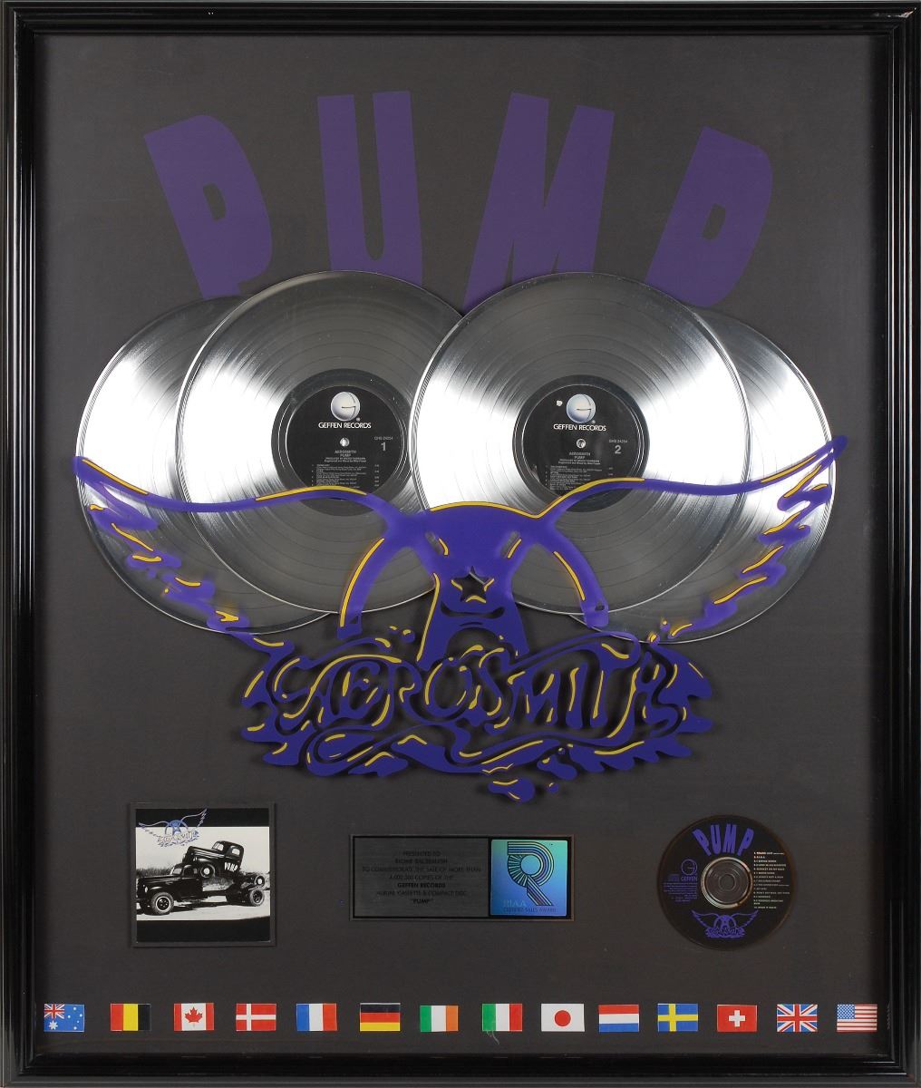 Official ‘R’ hologram-style RIAA multi-platinum sales award presented “to commemorate the sale of more than 4,000,000 copies of the Geffen Records album, cassette & compact disc ‘Pump.’” Framed with four discs, plate, CD, a small image of the album cover, and a row of fourteen international flags along the bottom edge to an overall size of 32 x 38, with attractive foreground and background graphic art. In fine condition. Oversized.