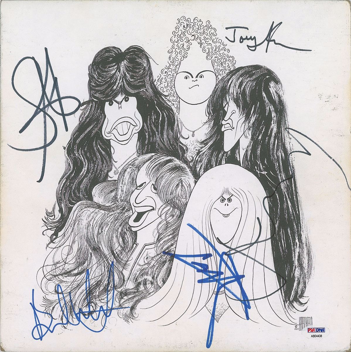 Draw the Line album signed on the front cover in black felt tip by Steven Tyler, Joey Kramer, and Joe Perry, and in blue felt tip by Brad Whitford and Tom Hamilton. In fine condition, with a bit of light scuffing. The record is included. Accompanied by a full letter of authenticity from PSA/DNA.