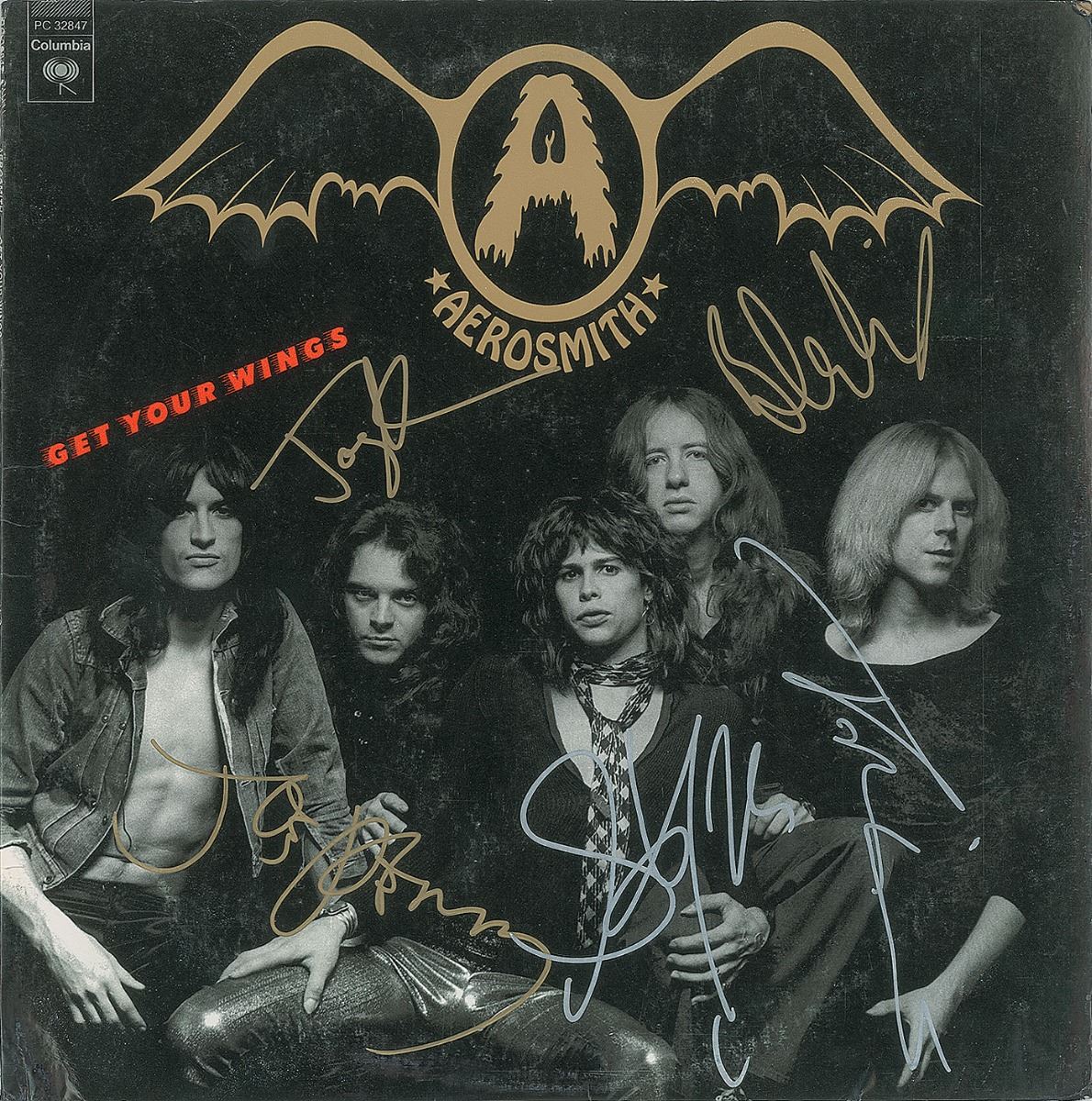 Get Your Wings album signed on the front cover in silver ink by Steven Tyler and Tom Hamilton, and in gold ink by Brad Whitford, Joe Perry, and Joey Kramer. In fine condition. The record is included.