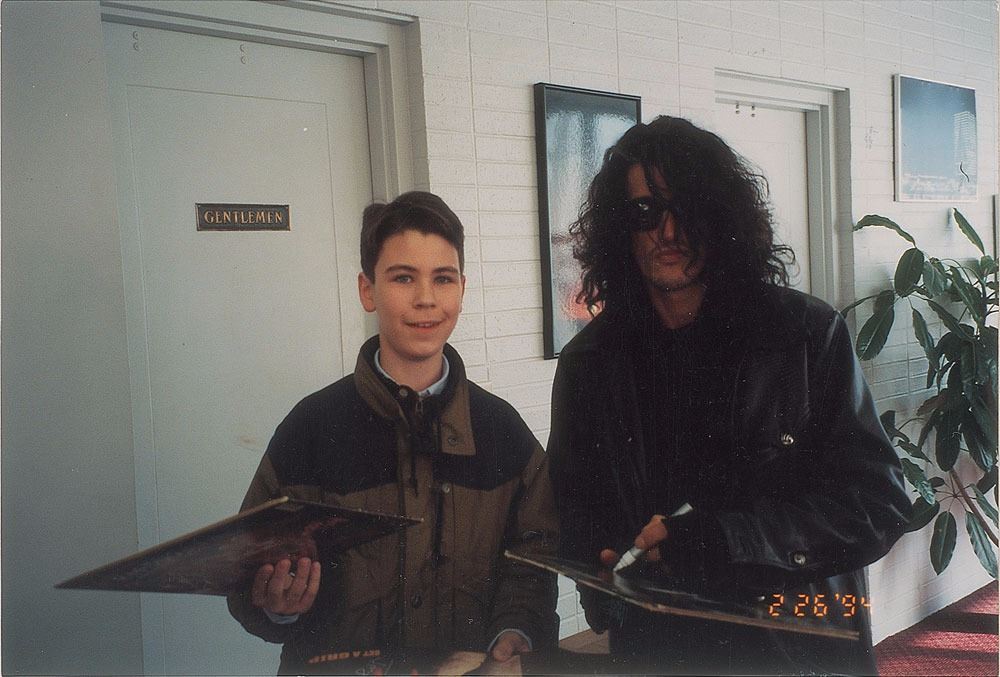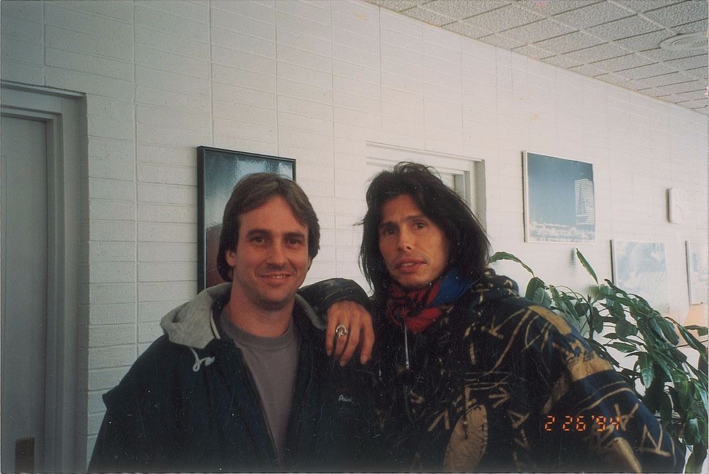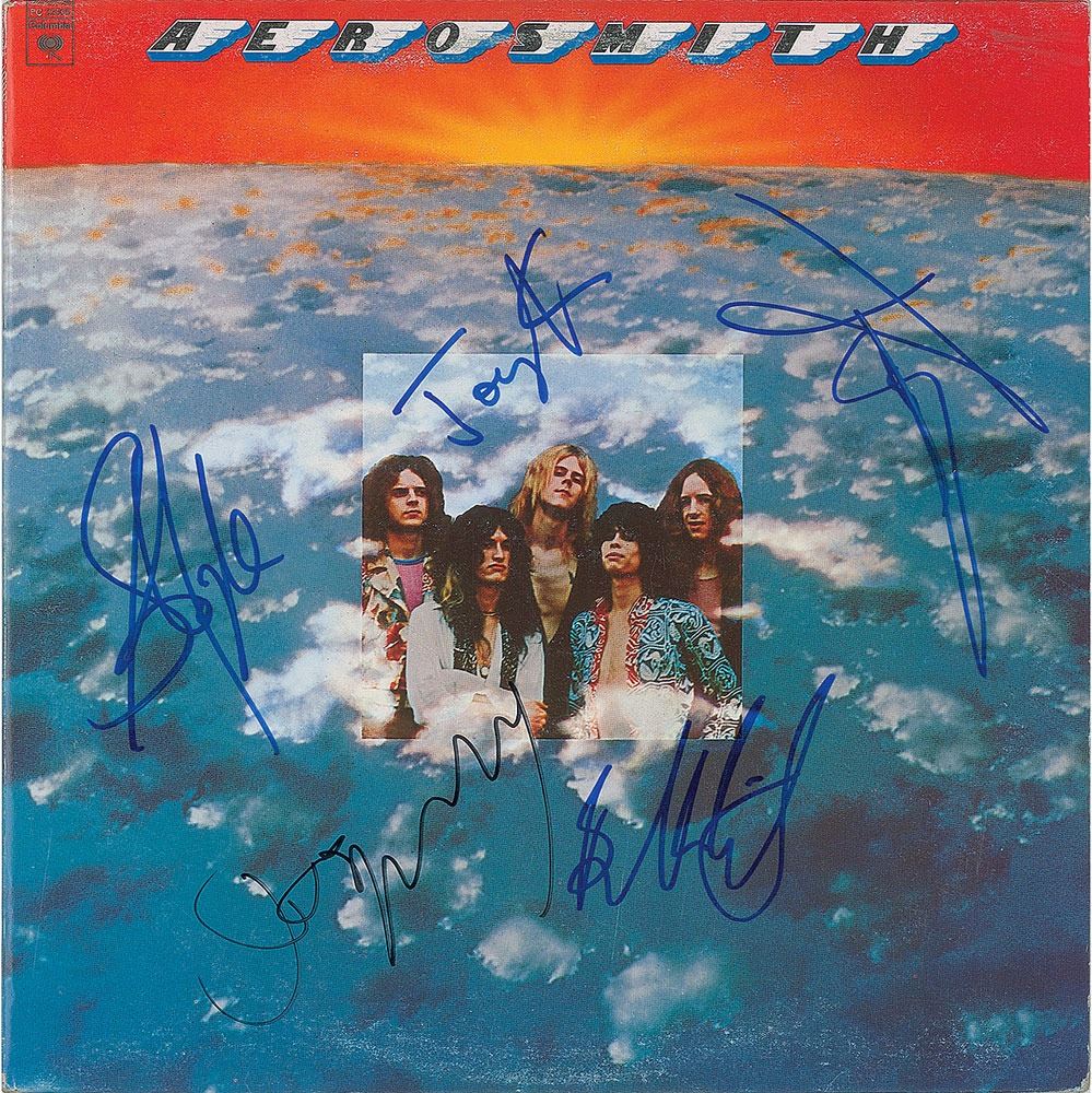 Self-titled debut album signed on the front cover in blue or black felt tip by Steven Tyler, Brad Whitford, Tom Hamilton, Joey Kramer, and Joe Perry. In fine condition. The record is not included. Consignor notes that the signatures were obtained at a private airfield in Toledo, Ohio, on February 26, 1994. Accompanied by photos taken at the time of the Tyler and Perry signings.