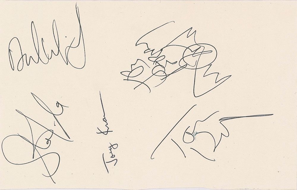 Ink signatures of Steven Tyler, Brad Whitford, Tom Hamilton, Joey Kramer, and Joe Perry, who adds a sketch of the Aerosmith logo, on an off-white 6 x 9.25 book page. In very fine condition.