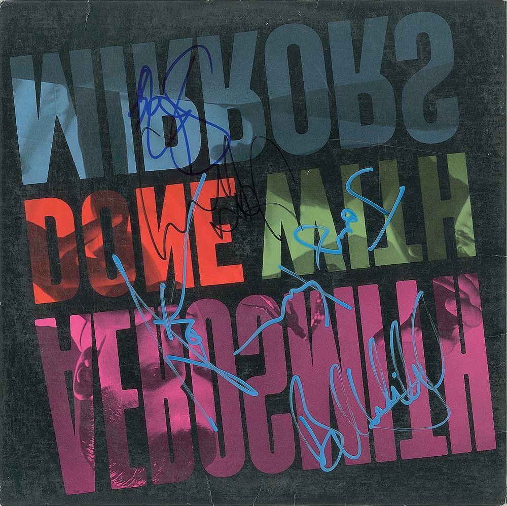 Done with Mirrors album signed on the front cover in blue paint pen by Brad Whitford, Tom Hamilton, and Joey Kramer, in black felt tip by Joe Perry, and in blue felt tip by Steven Tyler. In fine condition. The record is included.