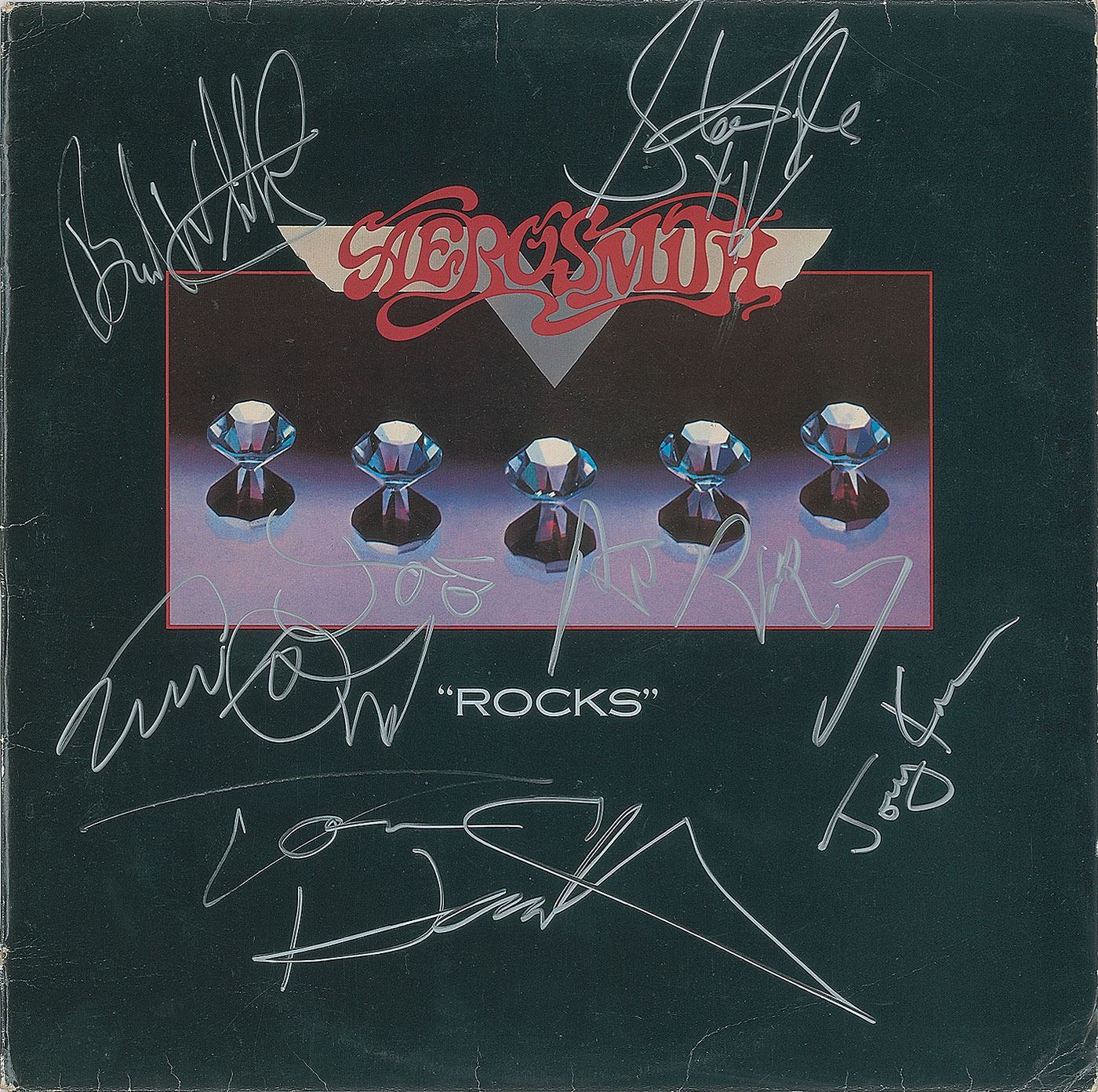 Rocks album signed on the front cover in silver ink by Steven Tyler, Brad Whitford, Joey Kramer, Tom Hamilton, and Joe Perry, who adds a sketch of the Aerosmith logo. In fine condition, with some light edge creasing. The record is not included.