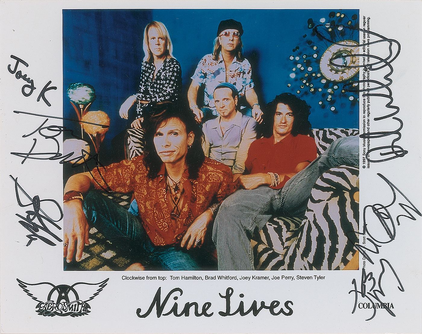 Color glossy 10 x 8 Columbia Records promo photo for Aerosmith's Nine Lives, signed in black felt tip by Steven Tyler, Joey Kramer, Tom Hamilton, Joe Perry, and Brad Whitford. In fine condition.