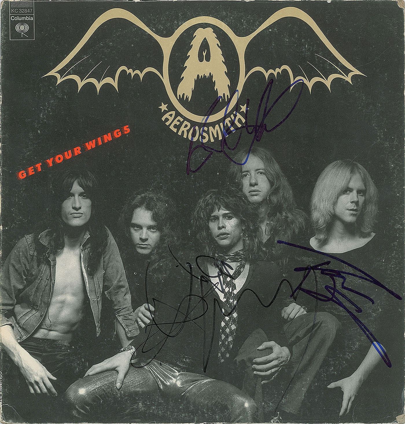 Get Your Wings album signed on the front cover in blue felt tip by Tom Hamilton and Brad Whitford, and in black felt tip by Steven Tyler and Joe Perry. In fine condition, with light scuffing. The record is not included.