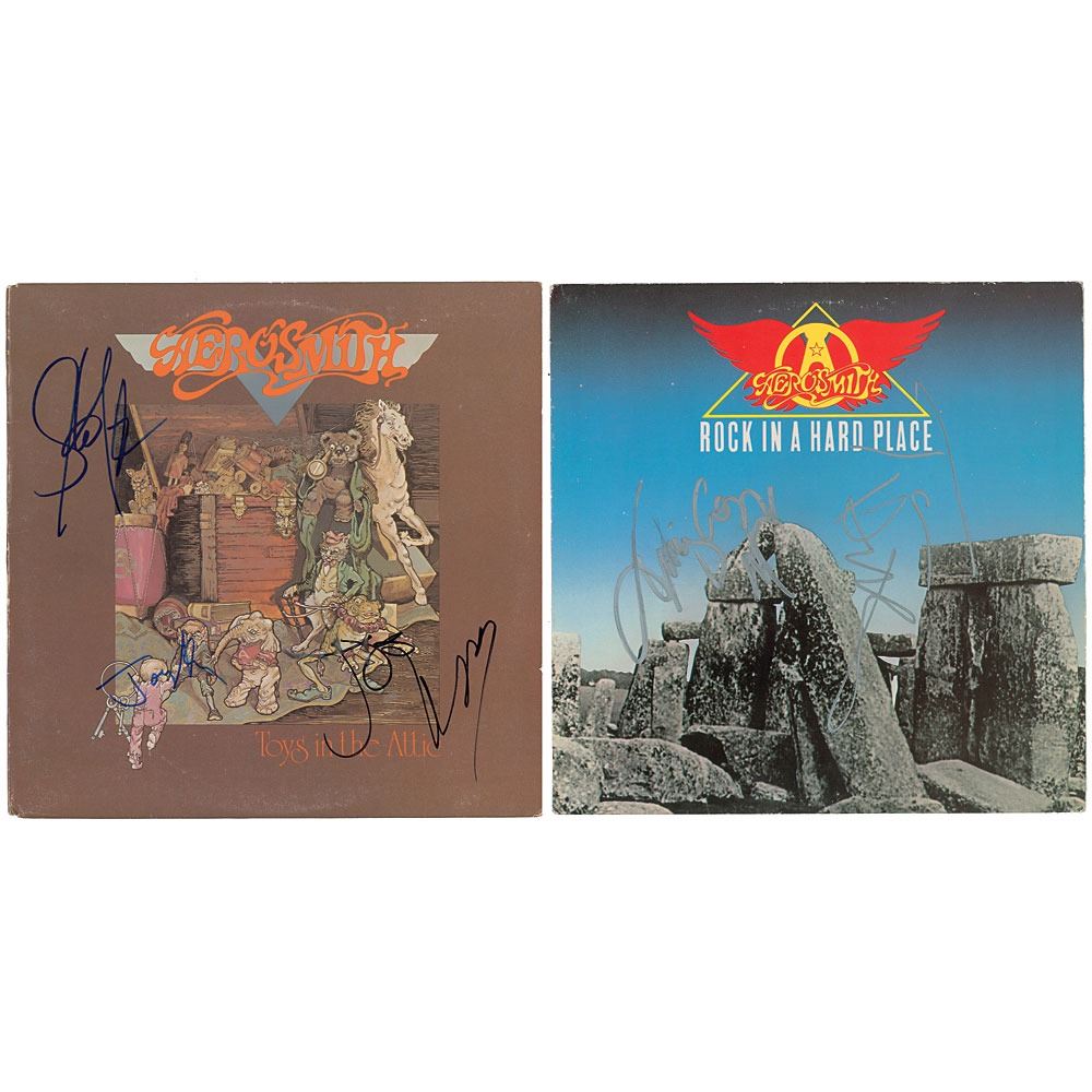 Two Aerosmith albums—Toys in the Attic, signed on the front cover in blue or black felt tip by Steven Tyler, Joe Perry, and Joey Kramer; and Rock in a Hard Place, signed on the front cover in silver ink by Tom Hamilton and Jimmy Crespo. In overall fine condition, with light scuffing to both. The Toys record is included. Consignor notes that the signatures were obtained at the Ritz Carlton in Cleveland, Ohio, with the exception of Crespo, who was obtained while touring with Rod Stewart.