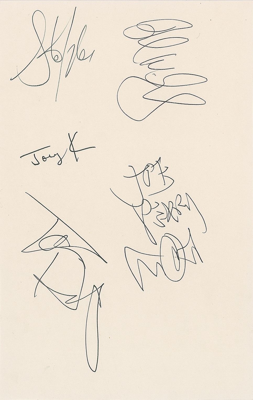 Ink and ballpoint signatures of Aerosmith—Steven Tyler, Tom Hamilton, Brad Whitford, Joey Kramer, and Joe Perry, who adds the band's 'wings' logo—on an off-white 6 x 9.25 sheet. In very fine condition.