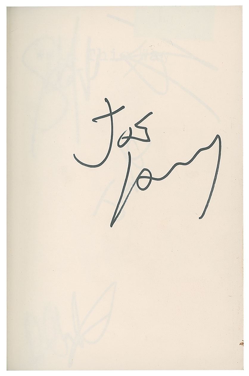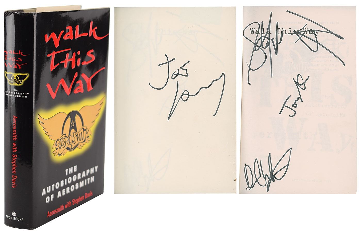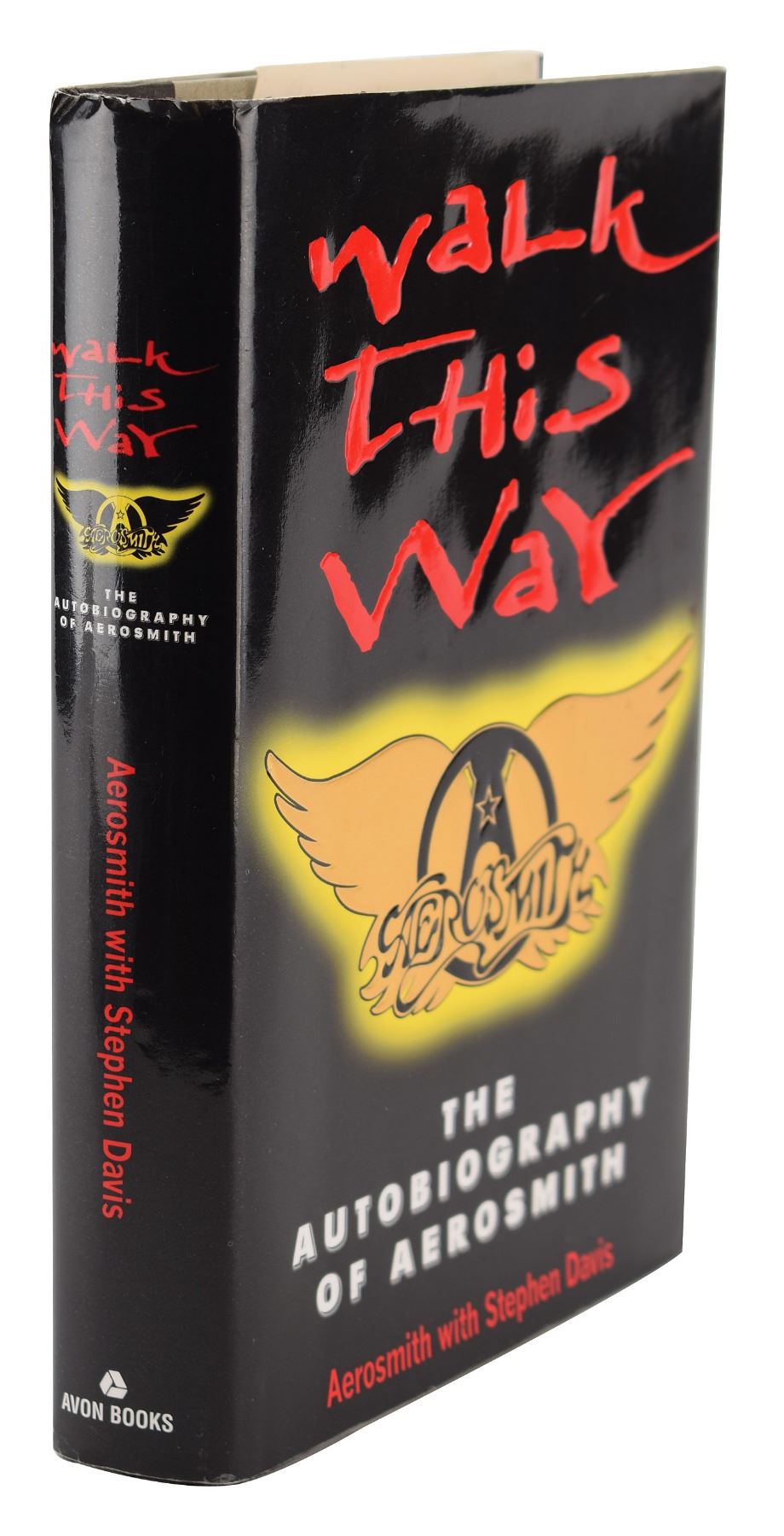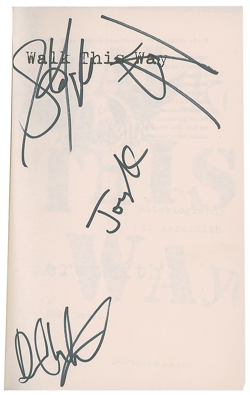 Signed book: Walk This Way. First edition. NY: Avon Books, 1997. Hardcover with dust jacket, 6.5 x 9.5, 513 pages. Signed on the first free end page in black felt tip by Joe Perry, and on the half-title page by Steven Tyler, Joey Kramer, Tom Hamilton, and Brad Whitford. In fine condition, with light wear to the dust jacket.