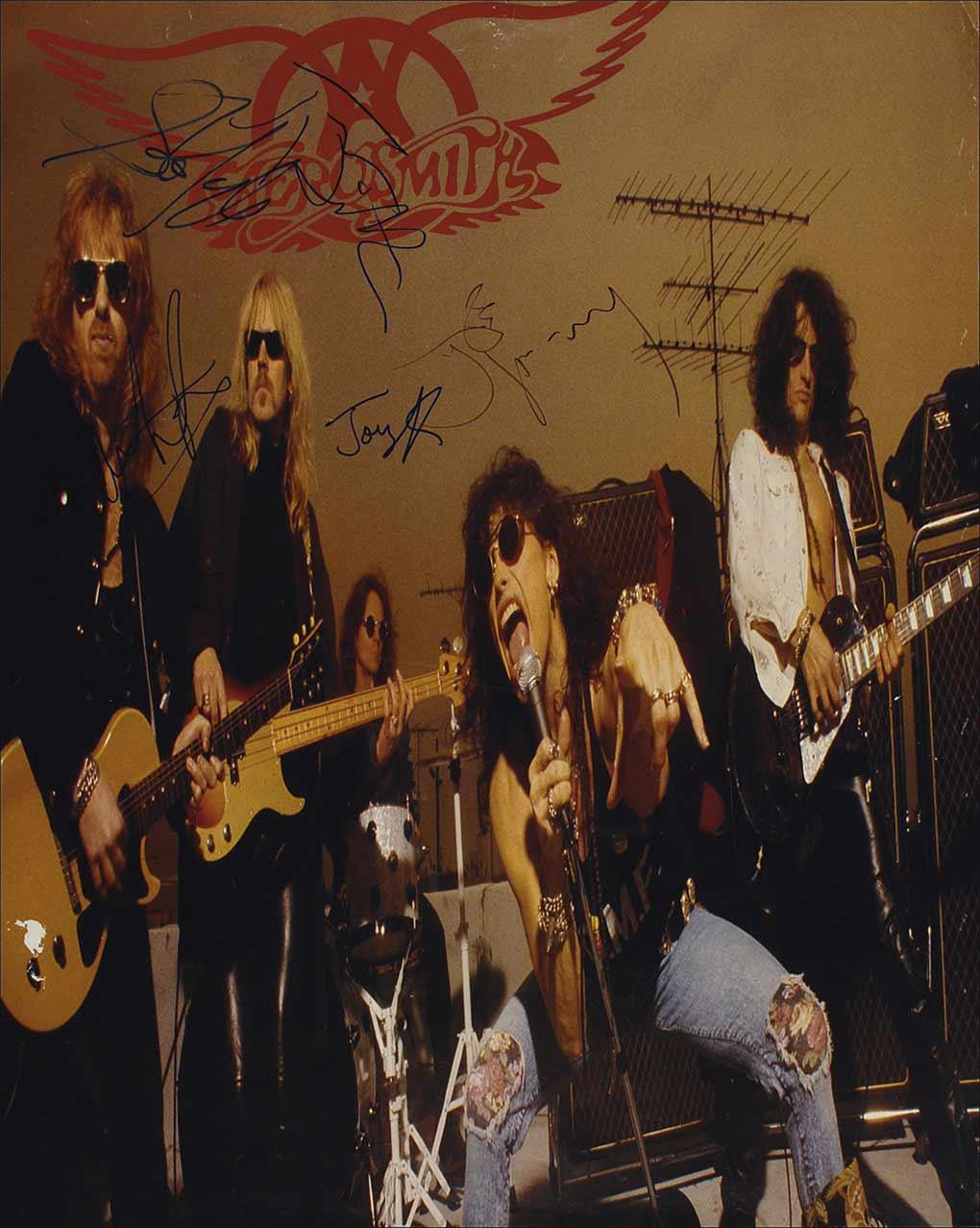 Color 21 x 26 poster of the band in action, signed in blue and black felt tip by Steven Tyler, Tom Hamilton, Brad Whitford, Joe Perry, and Joey Kramer. Rolled and in very good condition, with scattered creases and surface marks.